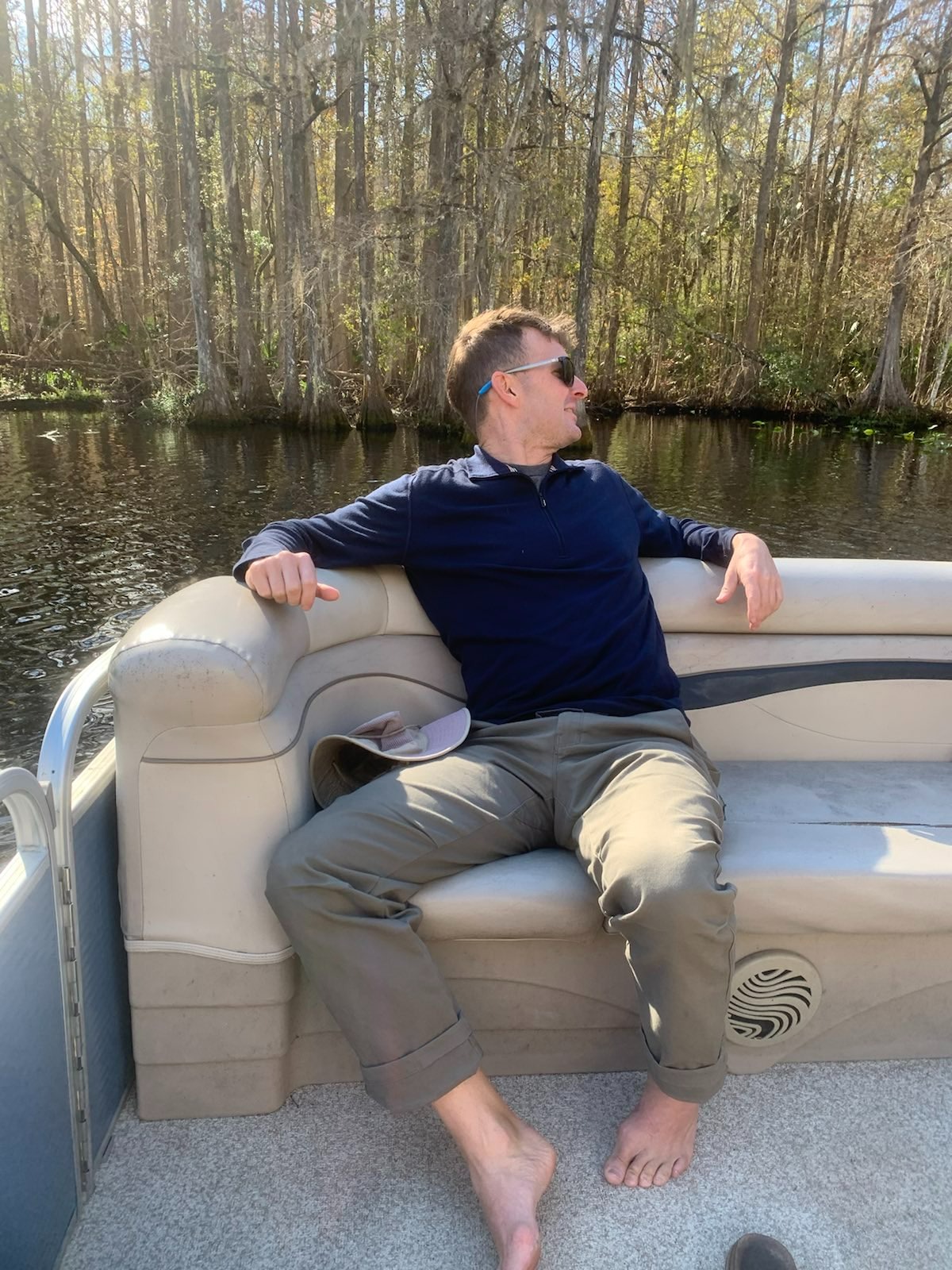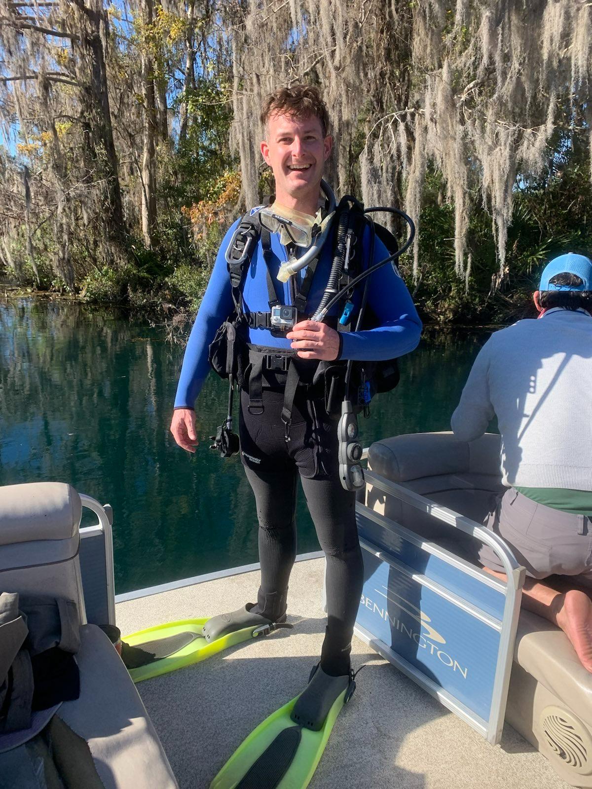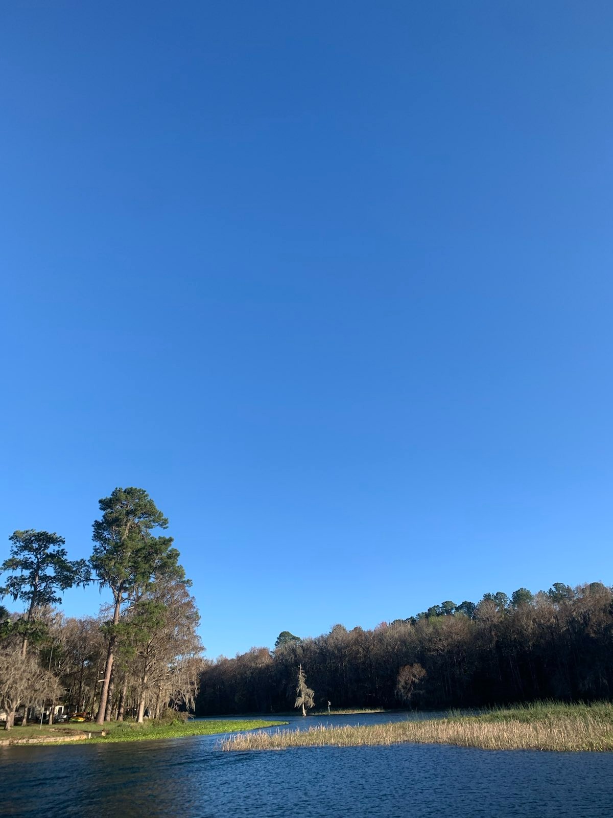 Our next river adventure was the following day when Gus rented a pontoon boat for us for an afternoon trip on the Rainbow River. After he and Alex were done coaching at the horse show for the day we loaded up and headed to Captain Bob’s marina in Dunnellon. Carrying scuba and snorkel gear, we loaded up the boat and headed upstream- first taking a detour into the blackwater Withlacoochee river to see if we could spot the notorious giant alligator. Sadly, he/she was hiding that day. We then backtracked back to the Rainbow River and it was wild how the two rivers converged- a clear delineation between the crystal clear water of the Rainbow and the black water of the Withlacoochee.