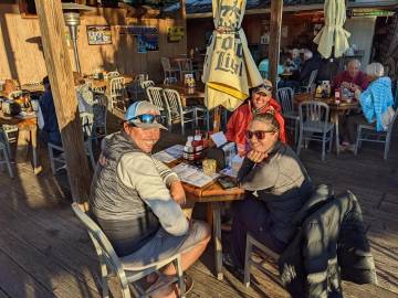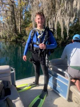 We went upstream on the Rainbow, observing the strict no-wake ordinance and eventually made our way into a cove where we dropped anchor for Gus to fish and for Scott to scuba dive. Despite Gus not catching anything, we still had fun- Alex and I tracking Scott’s progress along the lagoon via his bubbles. Once Scott was back on the boat we went upstream a bit farther, enjoying the scenery of the clear river and admiring the beautiful houses lining the waterway, before turning around and heading back for a seafood dinner at the marina’s riverside restaurant, the Blue Gator. I finally got the scallops that I had been craving the whole trip and they didn’t disappoint!