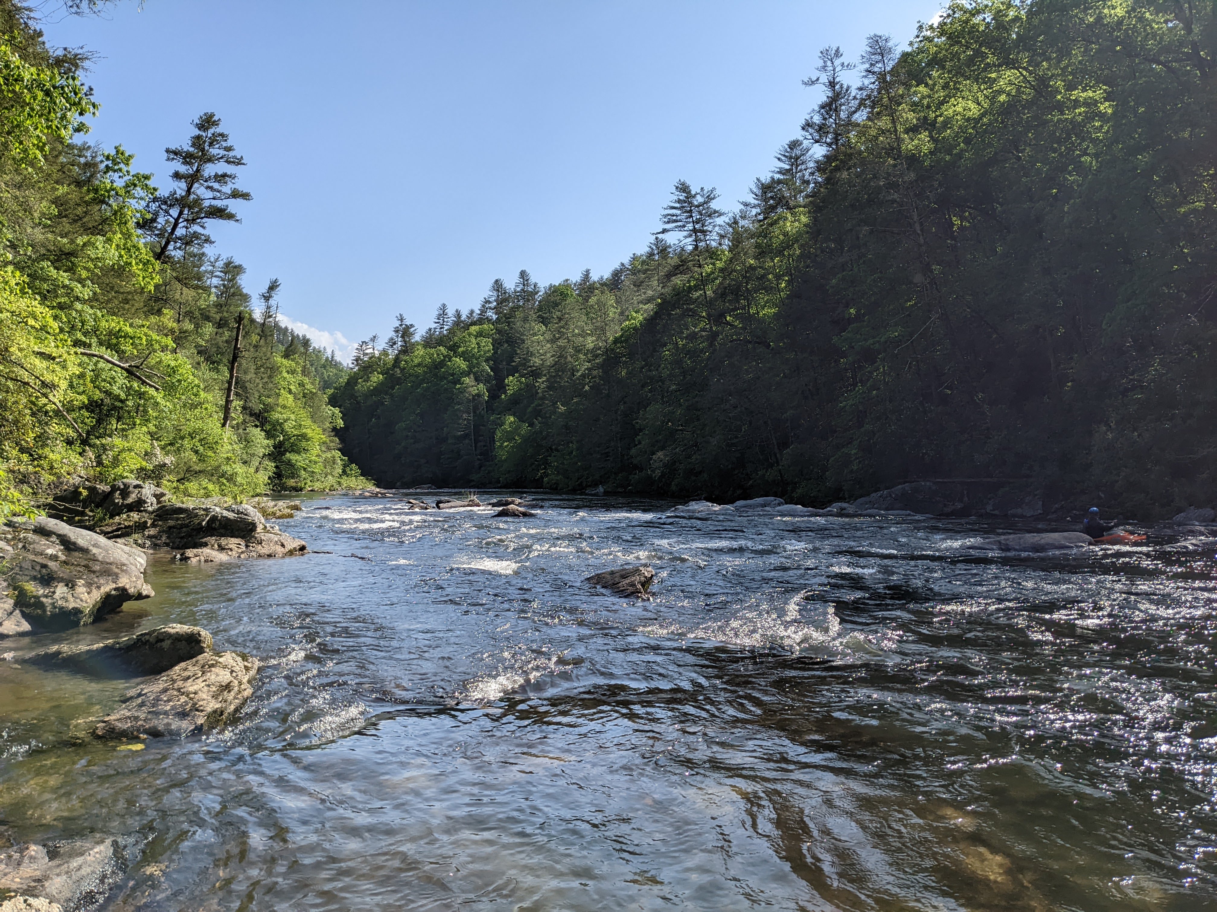 Section 3.5 of the Chattooga culminates with the notorious Bull Sluice rapid, and owing to its easy access from the highway, attracts many spectators. We had a few hours on the raft to get used to each other and learn how our captain commanded the raft before we tackled The Bull. Before we ran it, we beached the raft and got out to go look at the rapid and come up with a game plan for navigating it. Clayton told us what the plan was and we all knew what was expected of us. We got back into the raft and shoved off the shore and into the mainstream. My heart rate was through the roof and I was both nervous and excited. We took basically the line we wanted to but somehow got pushed sideways during the first part of the two part descent (this is not ideal) but managed not to lose anyone during the second drop. Lots of cheering and high five’ing happened after we ran the rapid and the ensuing adrenaline rush was intense!