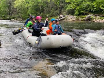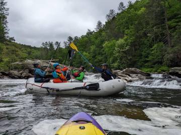 Our only mishap of the day happened at Woodall Shoals. This rapid is deceptively dangerous due to a large and strong hydraulic so its best to portage around it rather than run it. When we put the raft back into the river below the hole we didn’t paddle strongly enough to be successful in our ferry attempt and got pushed down into an impassable section of the rapid- too many boulders made it impossible to navigate. We had to fish the raft out of the river and back up to the base of Woodall and try again. This time we were successful and had a good run.