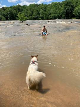 The Saluda river is right in between my apartment and Scott’s house so we took advantage of its proximity and enjoyed a few canoe trips to “Ant Island” with the dogs and a few trips down it on tubes. The dogs have turned into excellent canoe passengers and get excited about paddling with us. Ollie likes to bite at the water coming off the oars and Andi likes to stalk things from the comfort and safety of her vessel. It can be squirrely when they both decide to move around the canoe at the same time but the more often we take them out, the better they are getting at being still and sometimes will even lie down. Andi’s confidence level swimming has increased since we got her a doggy life vest. Although she still needs some coaxing, she is now more comfortable swimming back and forth between Scott and I. She enjoys investigating the little island and Ollie loves standing in the water, smacking, splashing, and barking at it.