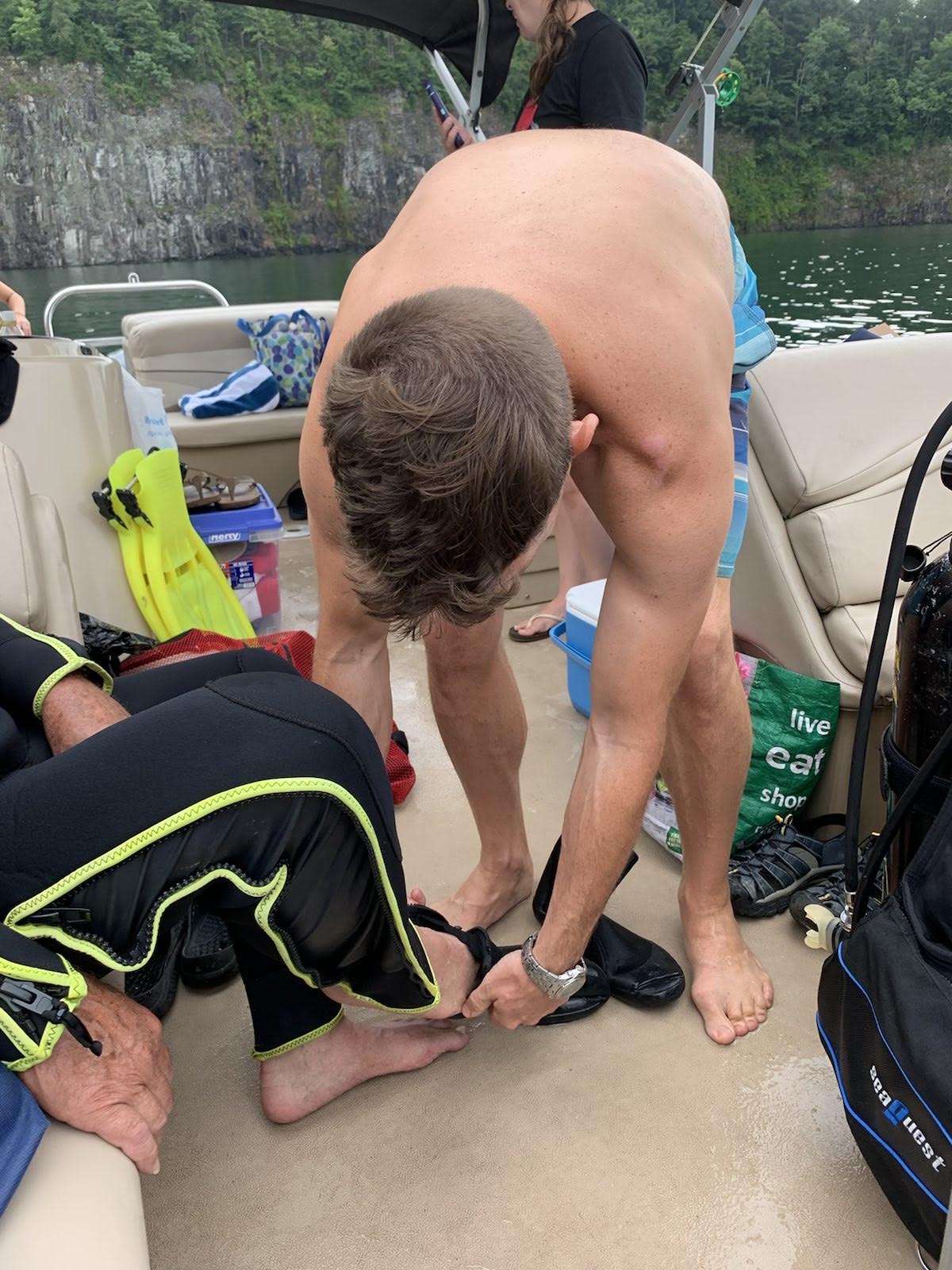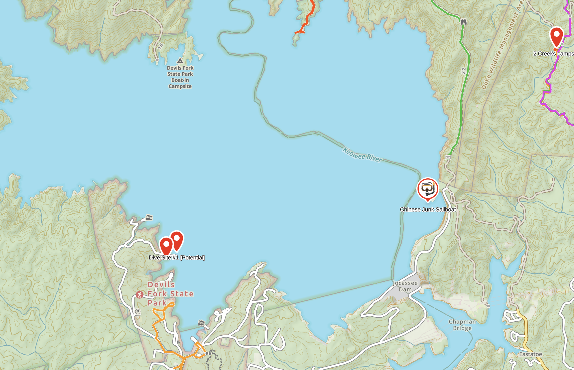 Since we had a hard time finding details as to the location of the Chinese Junk Sailboat and diving playground area, I thought I’d include a map and GPS coordinates, 34.96874, -82.91462. If my memory serves me, the deck of the boat was at 53 feet.