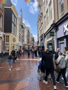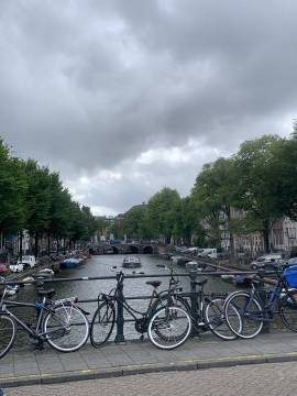 Having consumed the frites, we then wandered around the city. We explored many of the side streets and then made our way to the canals. We were amazed by the sheer amount of bicycles that we encountered- it seemed that the bike traffic may have outnumbered the foot traffic and you had to keep your head on a swivel to avoid veering into the path of speeding bikes hurtling at you. The episode of Ted Lasso that depicts a team trip to Amsterdam captures this chaos perfectly when Rebecca ends up in a canal dodging bikes! The bridges over each of the canals were decorated with flowers in pretty planters and were adorned with even more bicycles- those that were not currently being ridden around the city. We enjoyed seeing all of the different flavors and styles of houseboats docked along the canals and sat for a bit and watched the boat traffic inside the canals- its own little highway.