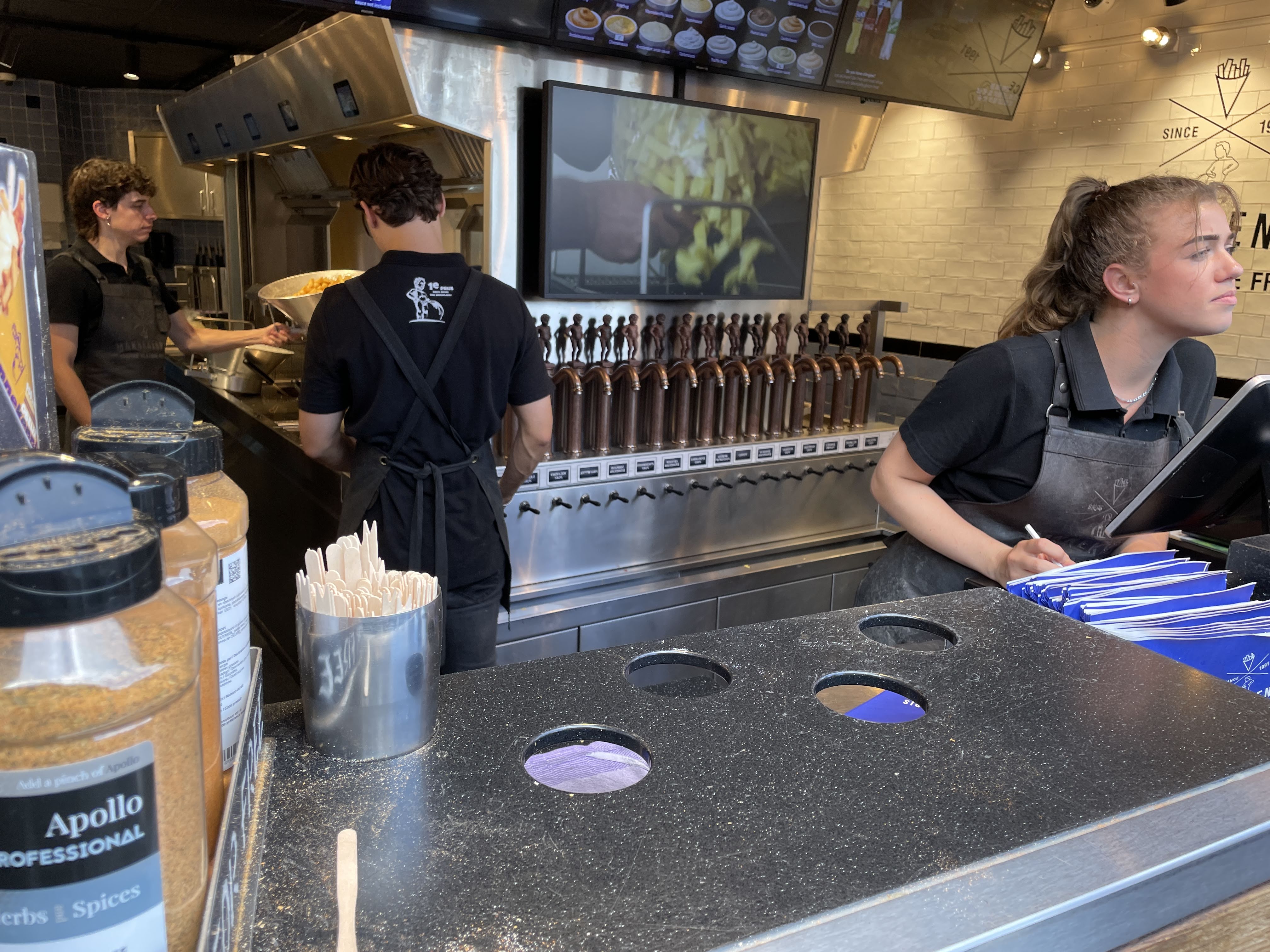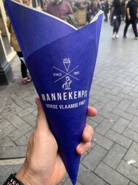 Frites are a hugely popular snack food and side dish in the part of Europe we visited, owing to the fact that they originated in Belgium, and were one of the must-do’s on our travel list. We had been told to expect to have them with mayonnaise and not ketchup so when the frite stand attendant asked what sauce I wanted, I of course asked for the “fritessaus.” It turned out to be tasty, albeit less fatty and more sweet than a typical mayonnaise. In Amsterdam and Brussels there seemed to be a frite stand on every corner and the lines would extend out into the road and would be packed at all hours of the day, even first thing in the morning. This particular frite stand that we visited was called Mannekenpis and it’s mascot/logo was the peeing boy of the famous Manneken Pis fountain/statue in Brussels.