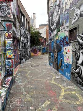 Our apartment looked directly down on an interesting Ghent feature: Graffiti Street, so that was our first stop. Graffiti Street is a short alleyway where graffiti is both allowed and encouraged and the only rule that applies is the “rule of the spray can” which evidently means you shouldn’t paint (paint? Or would it be draw? Maybe spray?) over works that are better than yours and don’t be noisy late at night and disrupt the local residents. It was a wild thing to see and we enjoyed seeing the creativity and talent of some of the artists. The paint that has accrued on the buildings in the alley since Graffitti Street was born in 1995 must have been close to an inch thick.