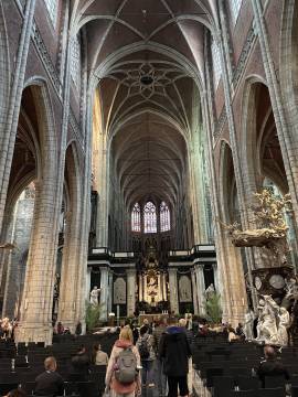 This cathedral is home to the magnificent Ghent Altarpiece which is also called the Adoration of the Mystic Lamb. It has many claims to fame including being considered one of the great masterpieces of European art, being the first major oil painting, and its creation is considered to be what marks the transition from Middle Age to Renaissance art. It has a tumultuous and storied past and has been stolen multiple times from its conception in 1432 and up to WW1. During WW2 it was removed from Ghent and was supposed to be taken to the Vatican for safekeeping but while en route Italy declared themselves an Axis power so the Altarpiece ended up staying put in France for a bit. Hitler then seized it and it stayed in Bavaria until fighting ramped up in that area and it was moved to a salt mine in Austria. While safe from bombs the salt mine wreaked havoc on the painting and damaged the paint and varnish which meant it would need extensive restoration. The search and recovery mission for the masterpiece was a major plot point in the 2014 film The Monuments Men. It is certainly worth a Google search to see it and learn more about it. The line to go into the room where the Altarpiece is housed was quite long and we had things to do and places to see so we didn’t end up seeing it in person.