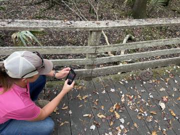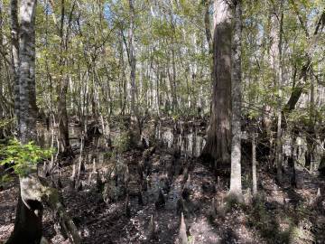 On our way back to the visitor’s center an employee appeared on the boardwalk about 50 yards in front of us and very calmly but firmly announced for us to stop because there was a water moccasin somewhere between us and him. We didn’t have to be told twice and stopped in our tracks, heads on a swivel. Snake stick in hand, the employee inched forward along the boardwalk in search of the snake. What he found (about 10 yards in front of us) was a nonvenomous, shy, and very common, brown water snake. A visitor that had passed by her previously had made the common mistake of misidentifying her. He invited us up to her and pointed out the features that often get them confused with water moccasins (a long mouth which enables them to grip onto fish gives them more of a triangular head which people mistake for a venomous snake as well as their shorter and wider body). She seemed nonplussed by our impromptu nature class and lay politely coiled so we could learn about her. The employee decided she was fine where she was and didn’t need to be shooed off the boardwalk since the center was about to close for the day. We headed back to the car and plugged in Becky’s address into the GPS.