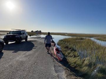 Once we arrived at the Gadsenville Road put-in and parking lot, we didn’t have to wait long. Joey Geiger was the trip leader and pulled in right after we did. Scott and I were happy that he would be leading us and could impart his expertise to navigate our way through the complex labyrinth of tidal creeks and marshes on the 3.5 mile outbound paddle to the island where we would be camping that night.