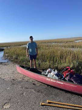 Everything was covered in sand and the mosquitos were still out in full force which made packing less than enjoyable but we got it done. We decided to hand walk our boats to the end of the island to avoid the breakers that were assaulting us as best we could which was still quite the task. The waves were determined to knock us off our feet and swamp our canoe and Joey didn’t have that much of an easier time. When we got around the corner of the island to the calmer channel, we beached the boats to bail them out. Thankfully both Joey and Scott had good bilge pumps and we were able to get enough water out to make them usable again. As we were pumping out the boats we spotted a bald eagle on a telephone pole near us, seemingly gazing down on us and watching what we were doing. A few minutes later another one flew by it and they vocalized to each other. (They don’t sound like TV and the movies make them sound like- they are much more high pitched and whistley. Fun fact- usually the sound you hear them making on TV, commercials, or movies is actually a red-tailed hawk call dubbed over their own calls.)
