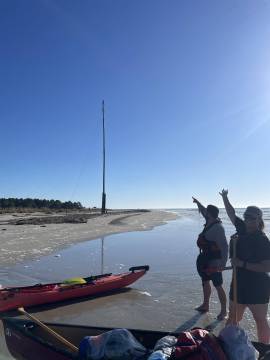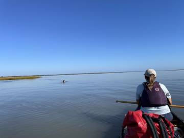 We loaded our boats and were ready to depart. The paddle out to the island took just a little over an hour to make because the tide was outgoing and carried us helpfully along with it. Right after crossing over the Intracoastal Waterway channel (we had to paddle swiftly because there were commercial shrimp boats trolling this watery interstate) we were treated to a dolphin sighting. It breached just a dozen or so yards in front of us- so close that we could see its dark eyes, the shimmer of its smooth gray skin, and hear the expelling of water and subsequent intake of breath through its blowhole as it glided through the water and up to the surface.