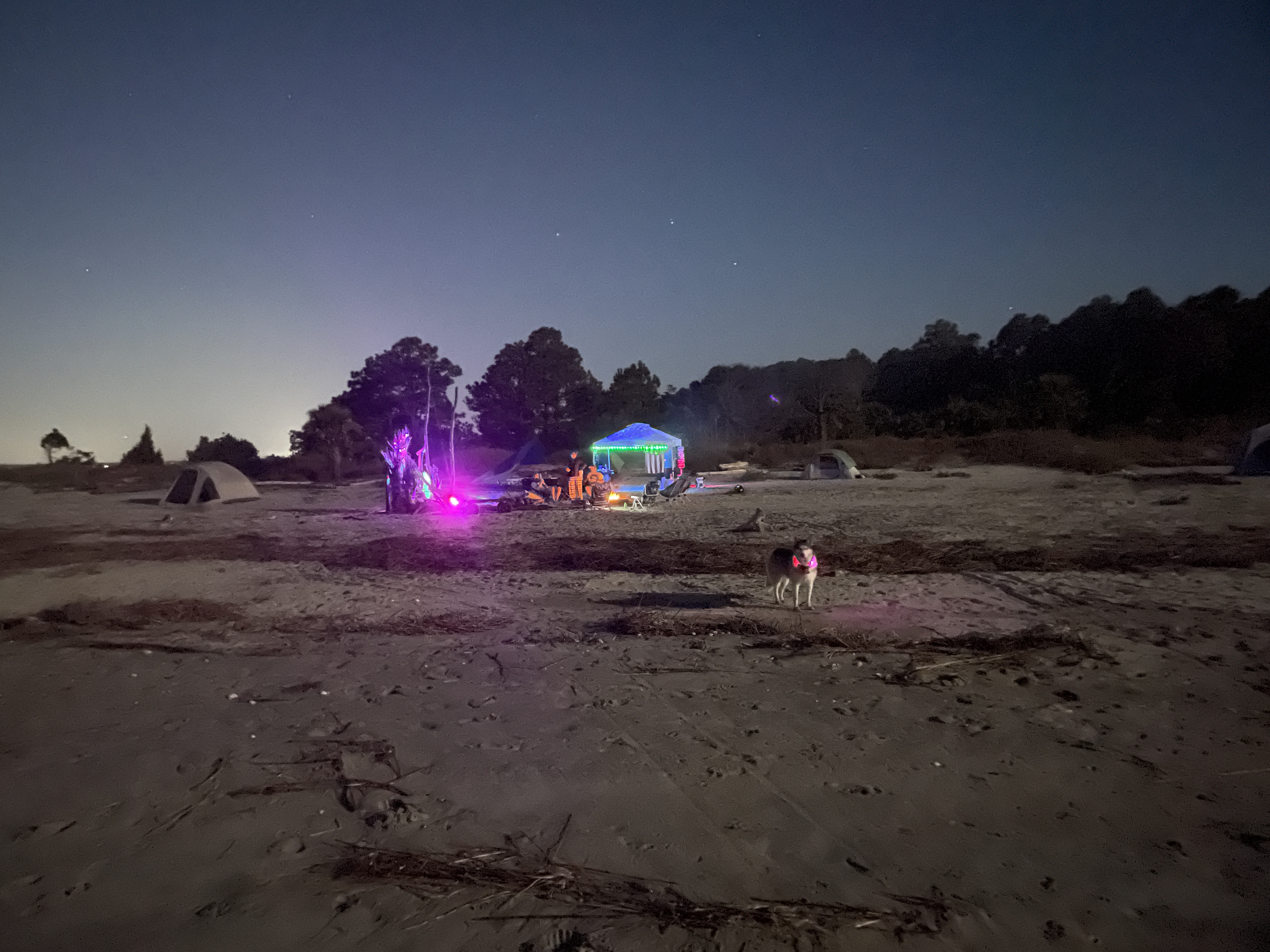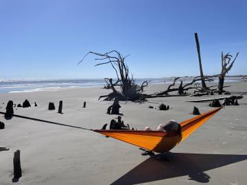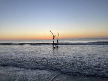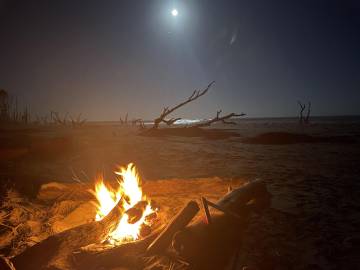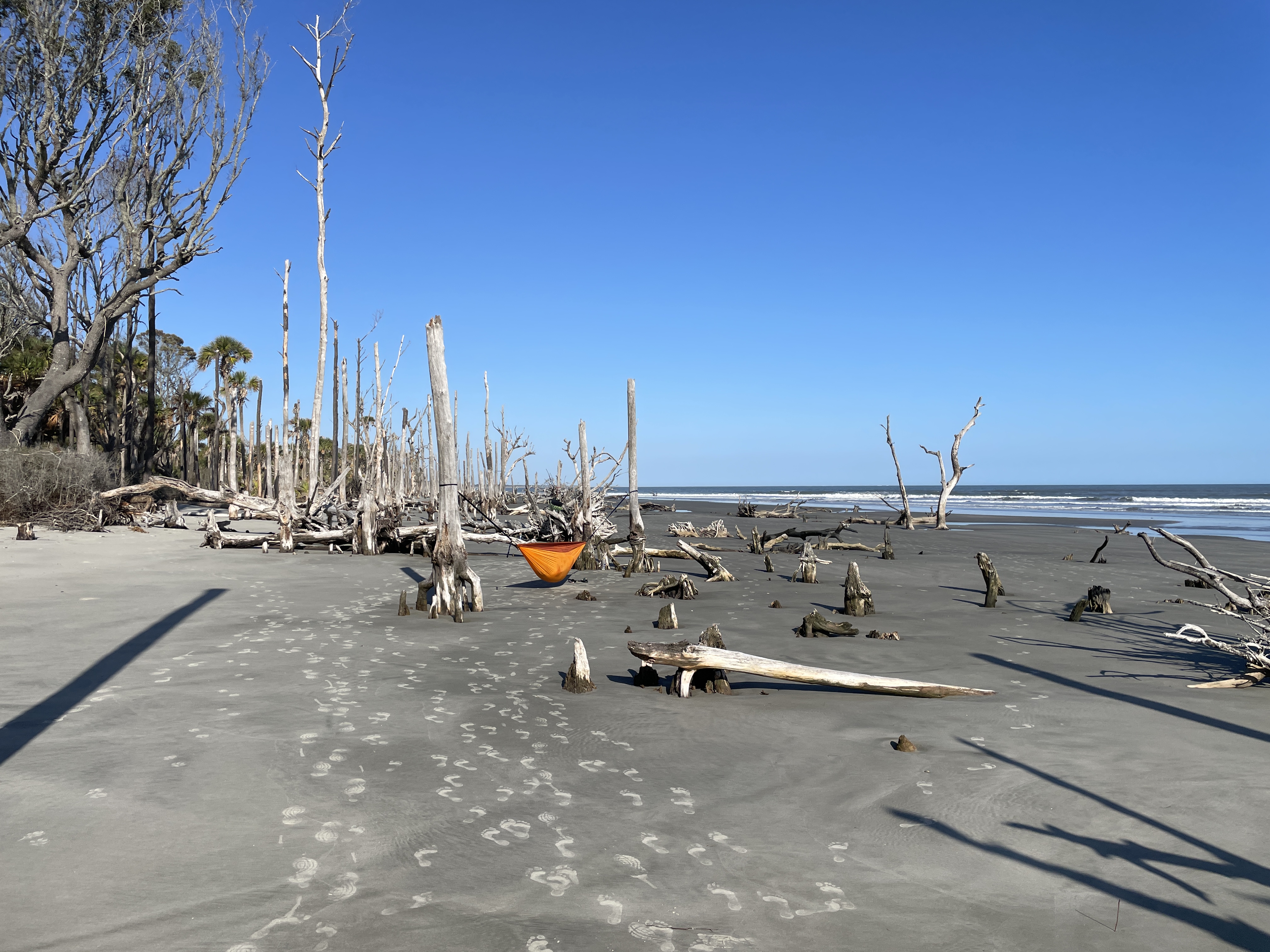 We had been advised by some campers already on the island to avoid the wooded area because the mosquitos were worse there because of the vegetation. Scott and I picked an area that was above the high tide line and not too close to the woods and Joey found some trees a little outside the woods to hang his camping hammock. We did a quick camp setup and then went to check out the “boneyard” beach which is an area of the island where the shore has been eroded away by the tides, winds, and hurricanes and have left dead trees on the shore. Some are still rooted and are in varying degrees of uprightness, and some are driftwood. At high tide the waves crash dramatically into the trees. The overall effect at either tide is a little eerie and looks like an abstract art exhibit.