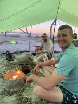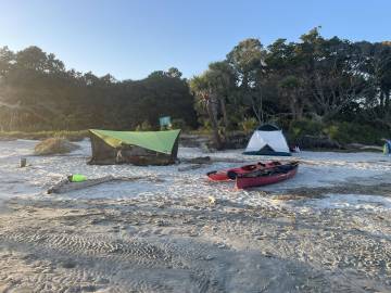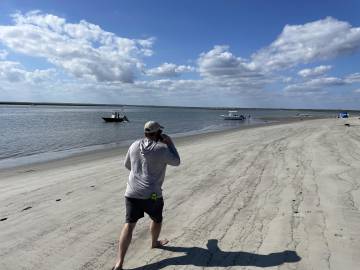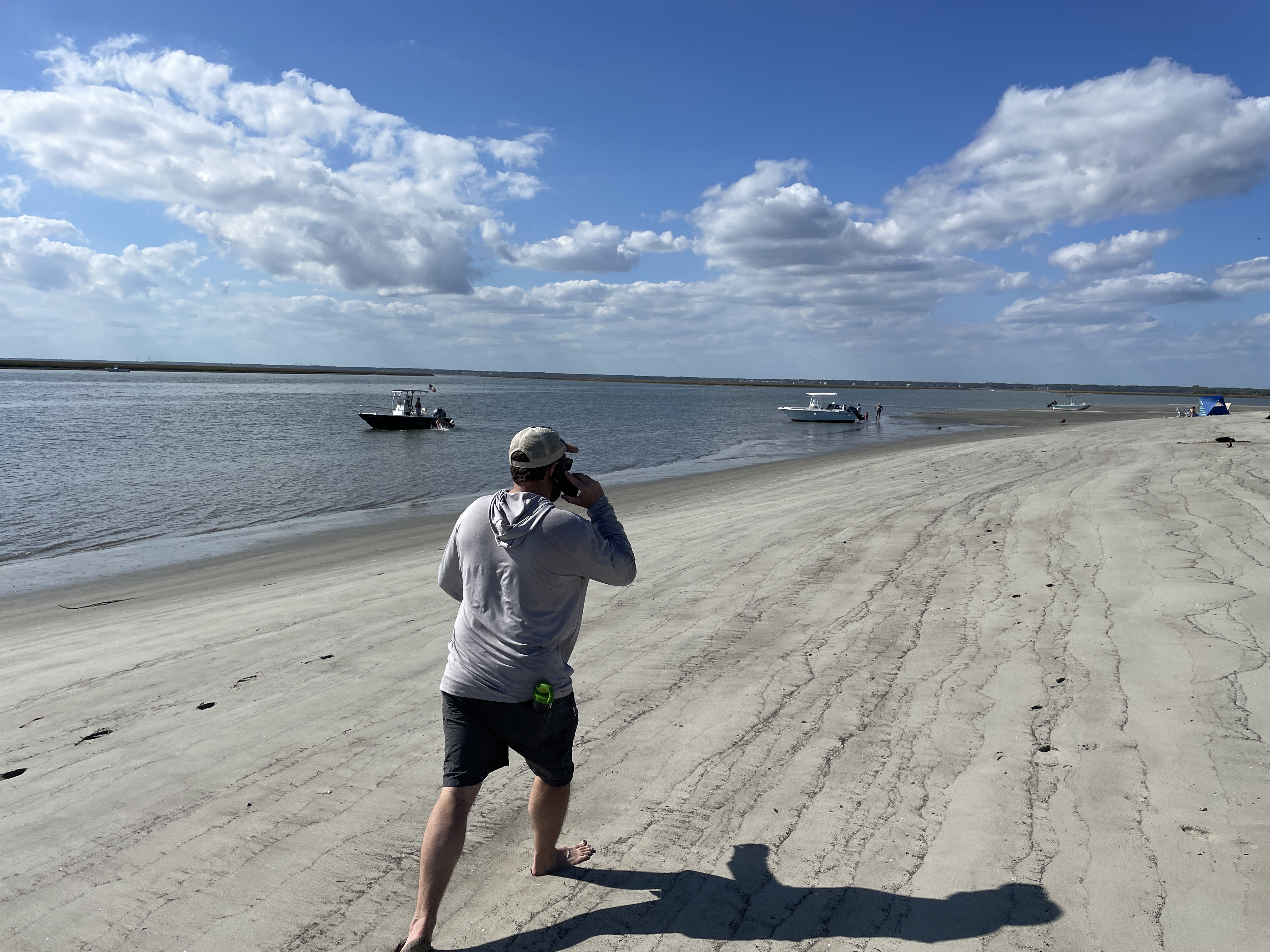 We all started off down the beach to talk to the other island campers and see if they had any clues. We were guessing that it must have been one of the guys that was in the camping spot that Joey had taken over once they left so we were in search of them or anyone that might have seen them (one was on a jet ski and one was on a standup paddleboard). While we were speaking with the other campers Joey received multiple phone calls from an unknown number. He finally answered and lo and behold it was the guy that had mistakenly grabbed his stuff. He was still on the island and was actually just a few yards away from Joey. They connected and the guy apologized profusely- his friend had asked him to bring his gear bag to him since he was on his SUP fishing on the other side of the island and he had mistakenly grabbed Joey’s stuff in addition to his friends. Thankfully they discovered it before they left the island but the guy assured us he would have come back with it as soon as they realized the mistake. The guys gave Joey a pound of bacon as a consolation prize and we all got a good laugh out of the experience. I was quite impressed by how composed Joey stayed- I think I would have been in panic mode!