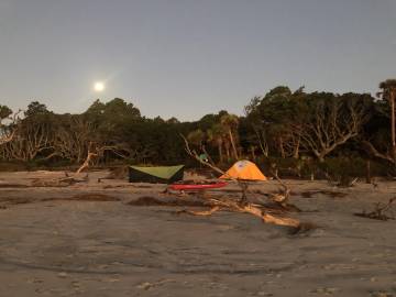 We relaxed for the rest of the afternoon, entertaining ourselves with hammocking, dips in the ocean, and strolls down the beach. The mosquitos that we had been warned of appeared about 5 pm and Scott and Joey set up the Nemo Bugout tent that Scott had brought to give us respite from the little vampires who were relentless in their pursuit of our blood. From our safe haven we were able to make our dinners and still enjoy the beach and waves. We made a little campfire outside the tent which in theory helped deter the mosquitos, but in reality I don’t think they were discouraged one bit. Despite the mosquitos we were still able to enjoy the sunset and the changing colors over the ocean and island as the sun retreated were beautiful. After the sunset, we retired to our tents and hammocks, tired but satisfied after a fun day.