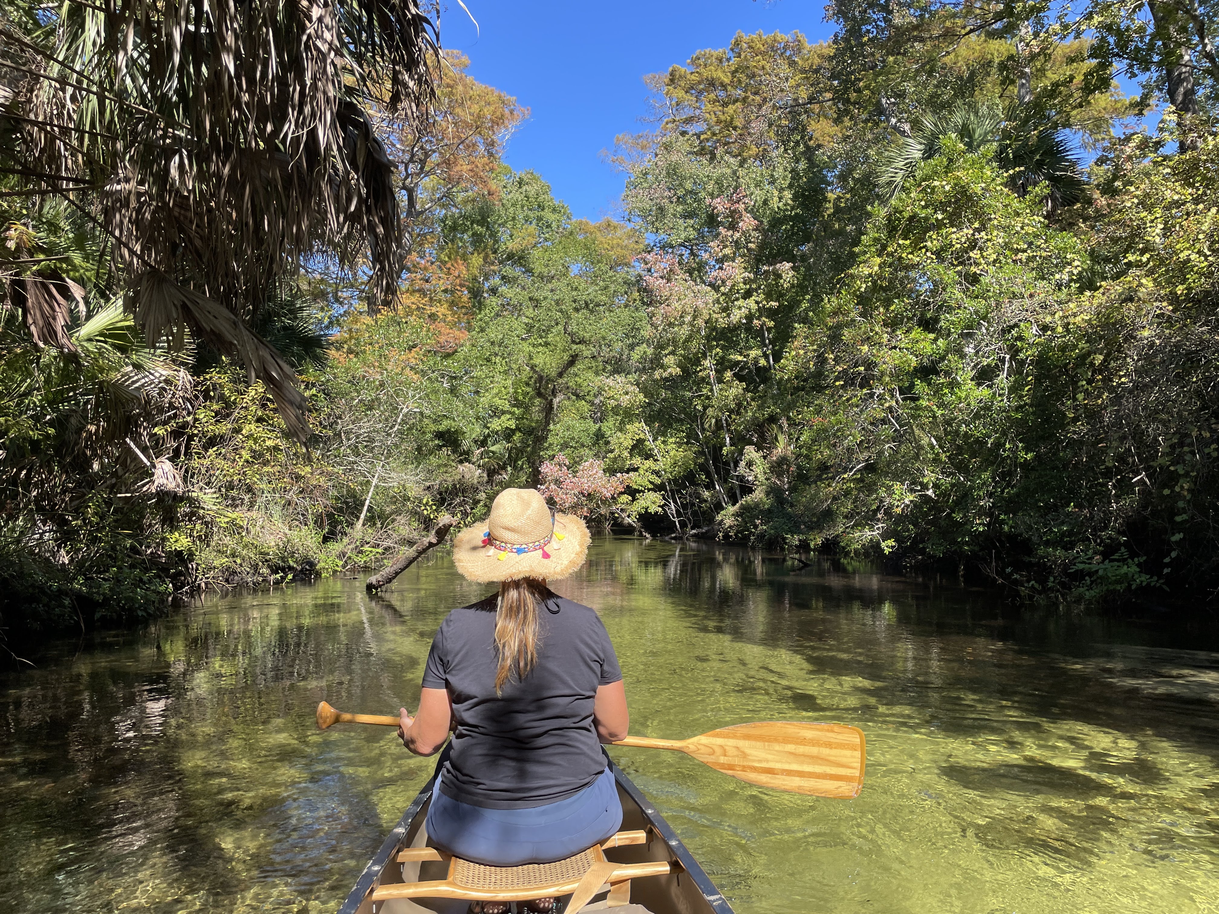 The creek here and the canoe launch made us feel like we were getting into a ride at Disney World. The creek banks were so close that there was just enough room for the canoe to slip between them, the thick subtropical forest made an arching canopy overhead, and the water was impossibly shallow and turquoise colored. It made it feel like we were launching our canoe into the water of It’s a Small World.