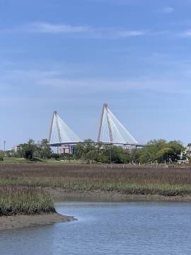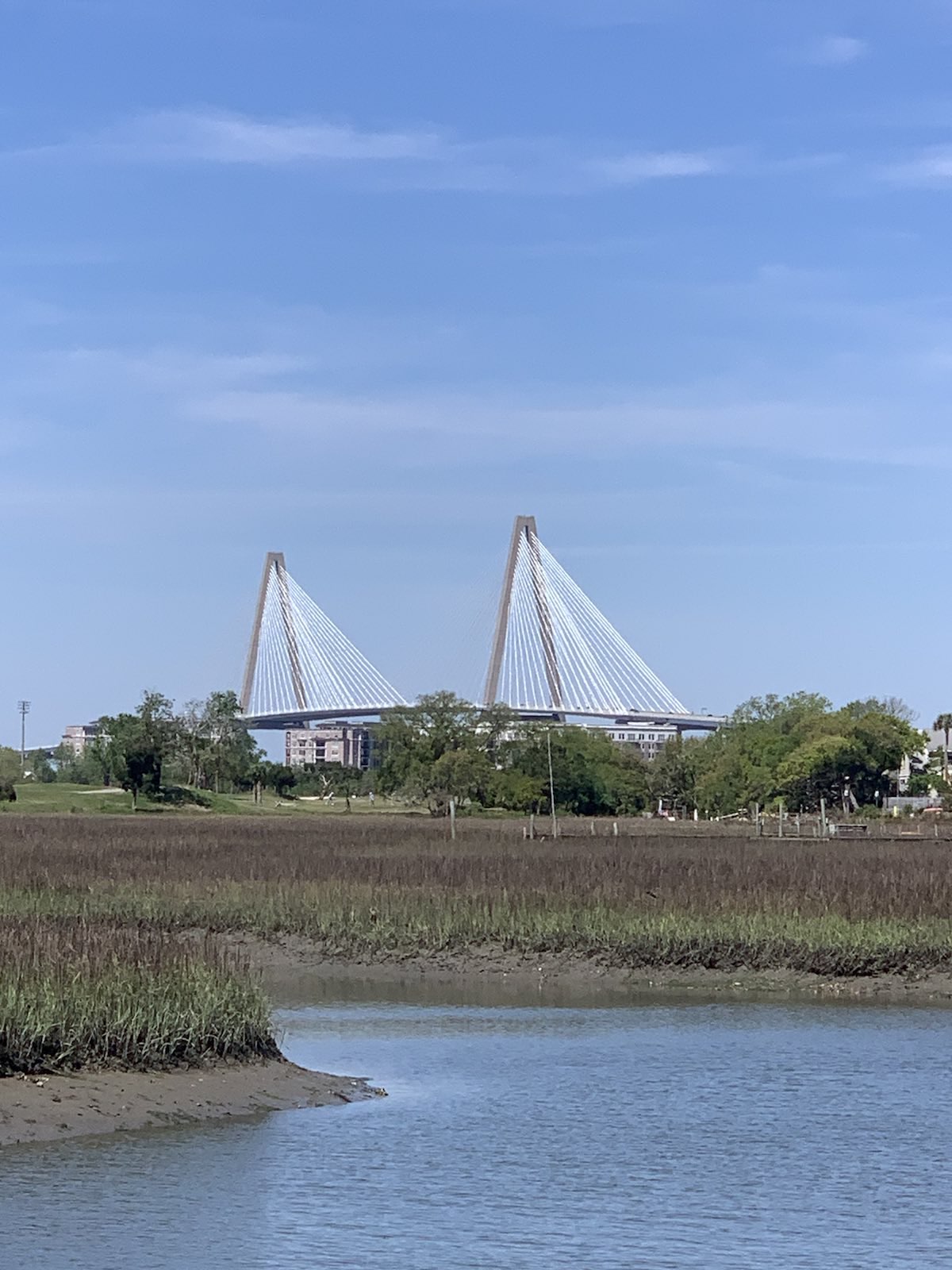 Sunday morning we said our goodbyes and Scott and I went to check out Isle of Palms. As we drove over the bridge it was fun to revel in our accomplishment from the day before and despite a very tired and sore body I was elated with how I had run and how I felt while doing it. It was nice taking a leisurely barefoot walk on the cool wet sand and seeing the Bridge in the distance. We were treated to a dolphin show and hung out and watched them feeding for a few minutes before heading back to the car. We drove through Sullivan’s Island to check it out and then went to Shem Creek for an early lunch, stopping at a restaurant we enjoy, Red’s Ice House. Full, tired, a little sore, but very content, we drove back home to Greenville, already thinking about the 2025 Bridge Run.