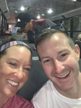 Saturday morning Becky graciously got up early with us and drove us as close as she could get us into downtown Charleston near Marion Square where the shuttle buses were lined up taking people over the bridge into Mount Pleasant. (We queued up quite near Mother Emmanuel AME church and while standing in front of it I reflected on the unbelievable evil that had occurred there in 2015.) The sheer logistics of putting this race on are mind boggling- there were easily over one hundred school buses running bridge repeats (see what I did there?) to take people from Charleston to Mt P. Driving in the area on race day is tricky since a good chunk of the roads in downtown Charleston are closed off and the bridge closes from 7 am until 11 am, hence the buses. We aimed to arrive for a bus about 6:15, which was later than last year and the majority of other bus riders had the same idea so we didn’t board until nearly 7 am. It was chilly and we wished we would have remembered the mylar blankets my mom had scored for us at BinTime that I had totally forgotten about until I stood shivering in just my t-shirt. Scott added them to our race gear packing list thankfully so we will be prepared next year.