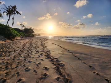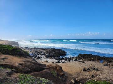 When our trail ride finished, I hopped off and hustled over to the arena to teach a few lessons. Scott helped take care of the horses and then headed out for a quick 2.5 mile hike at nearby Ka’ena Point State Park until it was time to pick me up and take me back to Kawailoa. (While it was a lot of travel back and forth, the facilities were only about 10 minutes away from each other so it wasn’t terrible.) The hike paralleled the rugged North Shore coast line and he got to see huge surf along the way, as well as remnants of the old railroad that used to run the perimeter of Oahu.