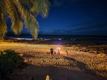 Scott, my faithful Uber driver, picked me up when I was done for the day and we headed in search of dinner. We stopped for takeout at a place called Seven Brothers across from Shark’s Cove. We walked across the street and had our dinner sitting on a brick wall overlooking the beach at the snorkeling spot (which was closed that day due to dangerous surf) and while we were eating we noticed some people on the beach playing with fire. Literally. A local fire dancing troupe were taking turns twirling fire sticks and “poi” (poi means “ball on a string”) which was mesmerizing to watch and was right up Scott’s alley. When we had watched our fill of fire dancing we headed back to Kailua, and as had become the norm, fell right into bed.
