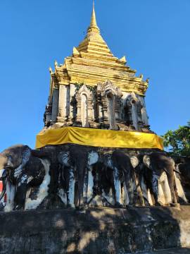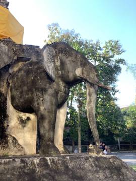 Wat Chedi Luang: This one might be my favorite because it had an asymmetry that gave it character- the top of the tall structure was missing, lost to an earthquake in 1545. It also had stone elephants around the temple. It was impressive because of its height and the grounds were decorated with elaborate colorful fabric lanterns.
