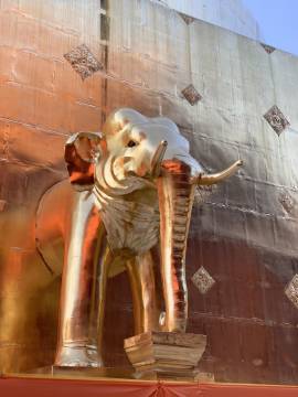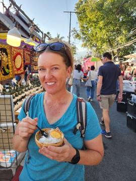 We came across a popular and crowded street market as we were working our way from wat to wat, and we strolled through it and found a few snacks. Most notable was the coconut ice cream that was pleasingly served in a coconut half-shell, and little individual serving size lasagnes. I also found a cute little faux leather elephant keychain and some pajama pants, and shockingly, Scott found a fun button-down shirt with a palm tree print. (He very seldom buys clothes and certainly not on a whim!)