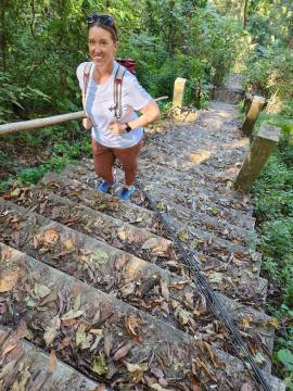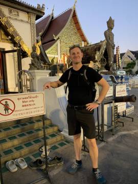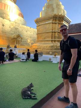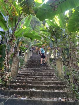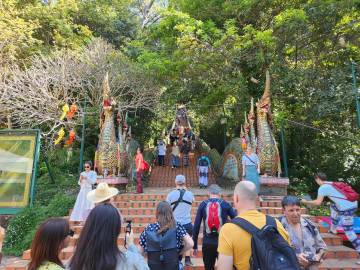 Disappointed by the inability to see anything exciting, we wandered off to see what else lay on the temple grounds. Not seeing anything particularly captivating other than some stray temple dogs, we decided to start our descent, this time opting for the 306 stairs of the Naga Staircase. At the base there was the typical Thai collection of souvenir shops and snack stalls and we each got a coconut smoothie for the return trip. We soon found our South Korean friends and the correct taxi and headed back into Chiang Mai.