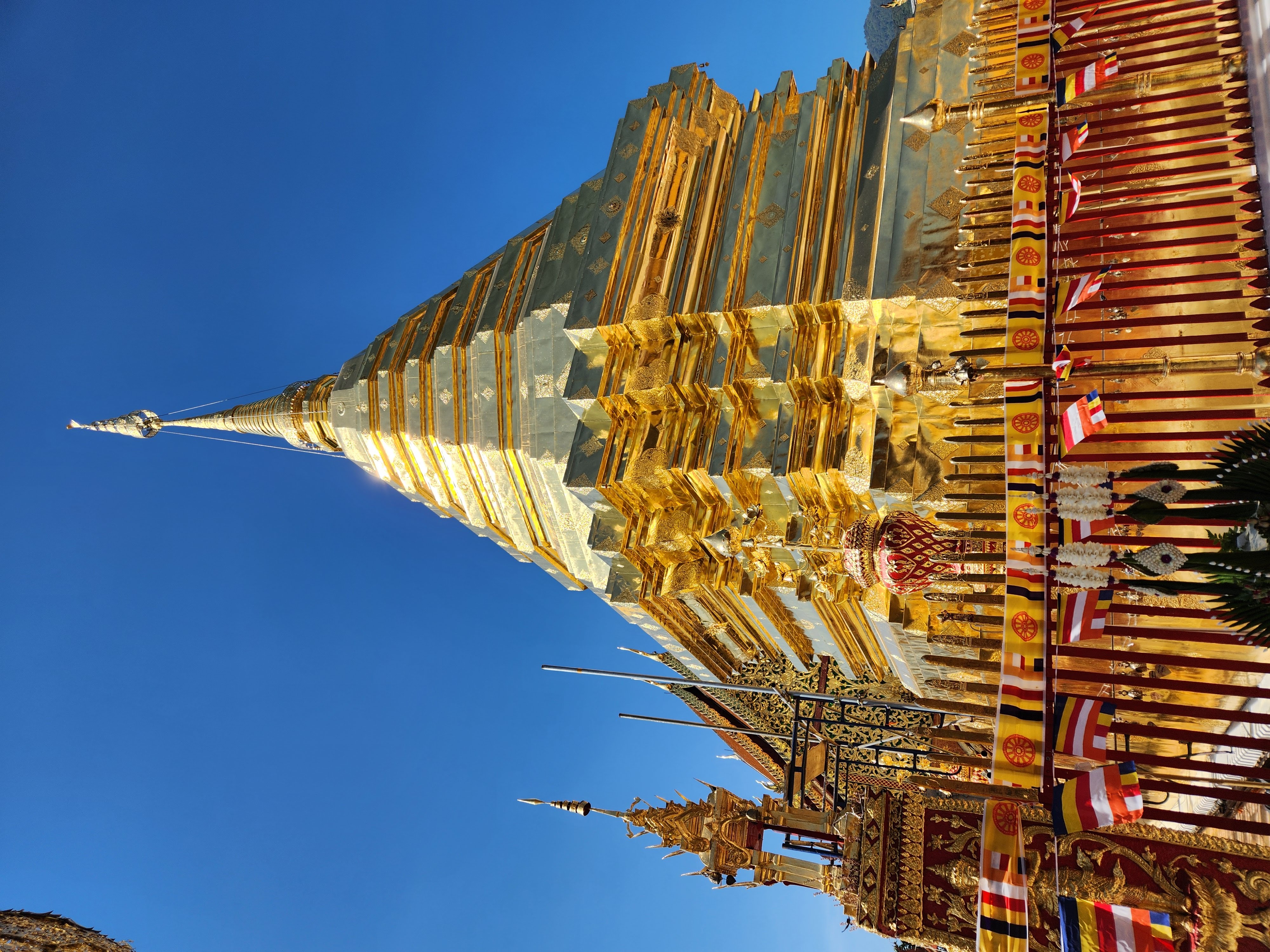 We saw a somewhat homemade looking sign to Doi Suthep and followed the path it was indicating, but we noticed that there weren’t many (and eventually, any) other people on it. For a moment we thought that we might be falling victim to another “common scam in Thailand” where an enterprising con artist has their own entrance to a temple or other point of interest and charges admission, when it turns out that there is actually no admission charge. But we carried on because Scott spied some derelict and somewhat looking abandoned steps in the distance that appeared to go to the temple. We survived the stairs, huffing and puffing our way up the steep ascent, and then all of a sudden we were inside a monastery and saw that we were at a side entrance to the temple. The monk who we surprised did a double take and then gave us a smile and a thumbs up; evidently he approved of our backroads sneak route to the temple.