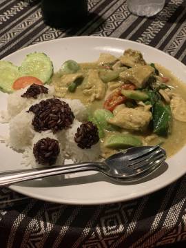 We had decided to try out Tikky Cafe for dinner, based on the recommendation from American travellers that we had met on our first night in Chiang Mai. We chose to walk the 3.5 km there to see more of the city. Along the way we passed a “Women’s Massage Center by Ex-Prisoners” and were perplexed as to what the heck that meant. Massages only for women? Or by women? Women “ex-prisoners” I suppose? So many questions. (Ahh, a quick Google search reveals that it is staffed by women who were formerly incarcerated and received vocational Thai massage training in prison.) We reached the restaurant and sat outside to wait for a table because it was quite crowded (always a good sign).