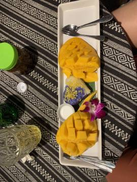 Dinner was superb. The food was excellent- I had green curry and the rice that came with it was shaped into the form of a teddy bear. It was so cute that I didn’t want to scoop into it to eat it. Scott had pineapple fried rice with cashews, and it came served in an actual pineapple that was cut in half. For dessert we had mango sticky rice for the first time and were immediately hooked. It is a common Southeast Asian dessert and we realized why it is so popular the moment we had our first taste. Too stuffed and exhausted to walk home, we opted for a cab and headed back to Fang Chiang Mai.