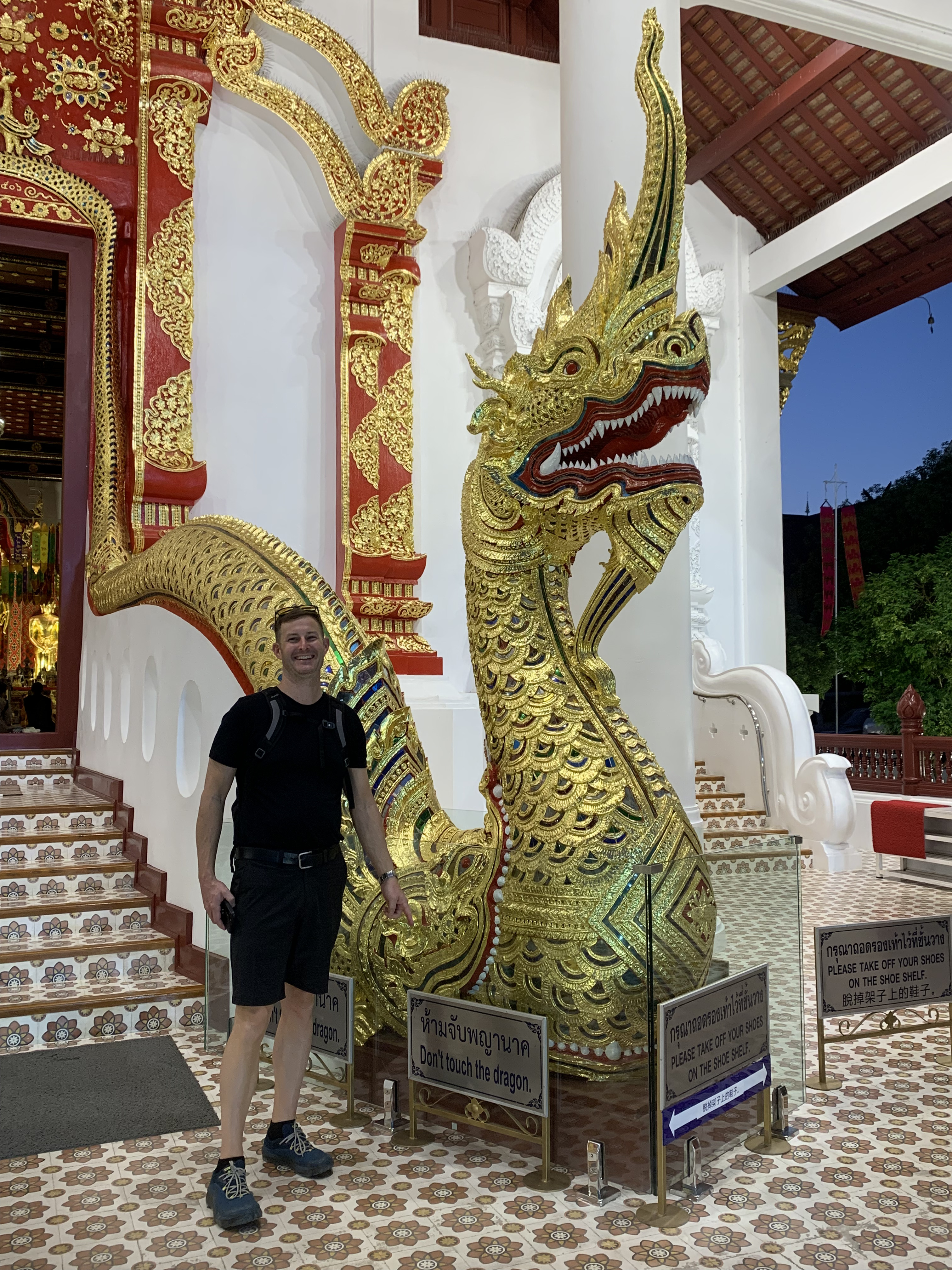 After our new friends were dropped off, Scott and I asked to be taken to the nearby Wat Sri Suphan, or the Silver Temple. We paid our admission, read the placards at the entrance, and then went in. I couldn’t tell you what the inside of the Silver Temple looks like because “SILVER BUILDING ONLY MAN INSIDE WOMAN WALK AROUND AND SEE PICTURE ON MOBILE. ONLY MAN BECAUSE MAN IN THAILAND BECOMES MONK. WOMAN DON’T BECOMES MONK ITS FORBIDDEN. THINK YOU FOR YOUR DONATION AND RESPECTATION.” I didn’t bother looking it up on my mobile and sat outside and took pictures of Scott who was cheekily posing with the “Only Men Inside” signs. (His report: “It looked like all the other wats. There was a buddha and pssst… it wasn’t even silver, it was gold.”)1 We did happen to see a woman trying to go inside the forbidden temple and an apoplectic employee quickly intercept her as he chastened her and explained to her the error of her ways.