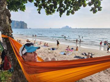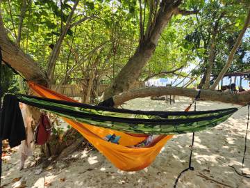 We could hear the beach before we could see, or rather, we could hear the infamous longtail boats whose repurposed automotive engine motors created an obnoxious din as the boats taxied tourists from one island to another. We hung the hammocks in trees near where the beachfront met the road that led to the resorts and we each took turns1 taking a dip in the Andaman Sea.