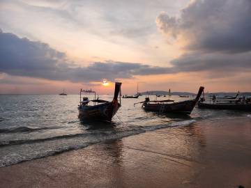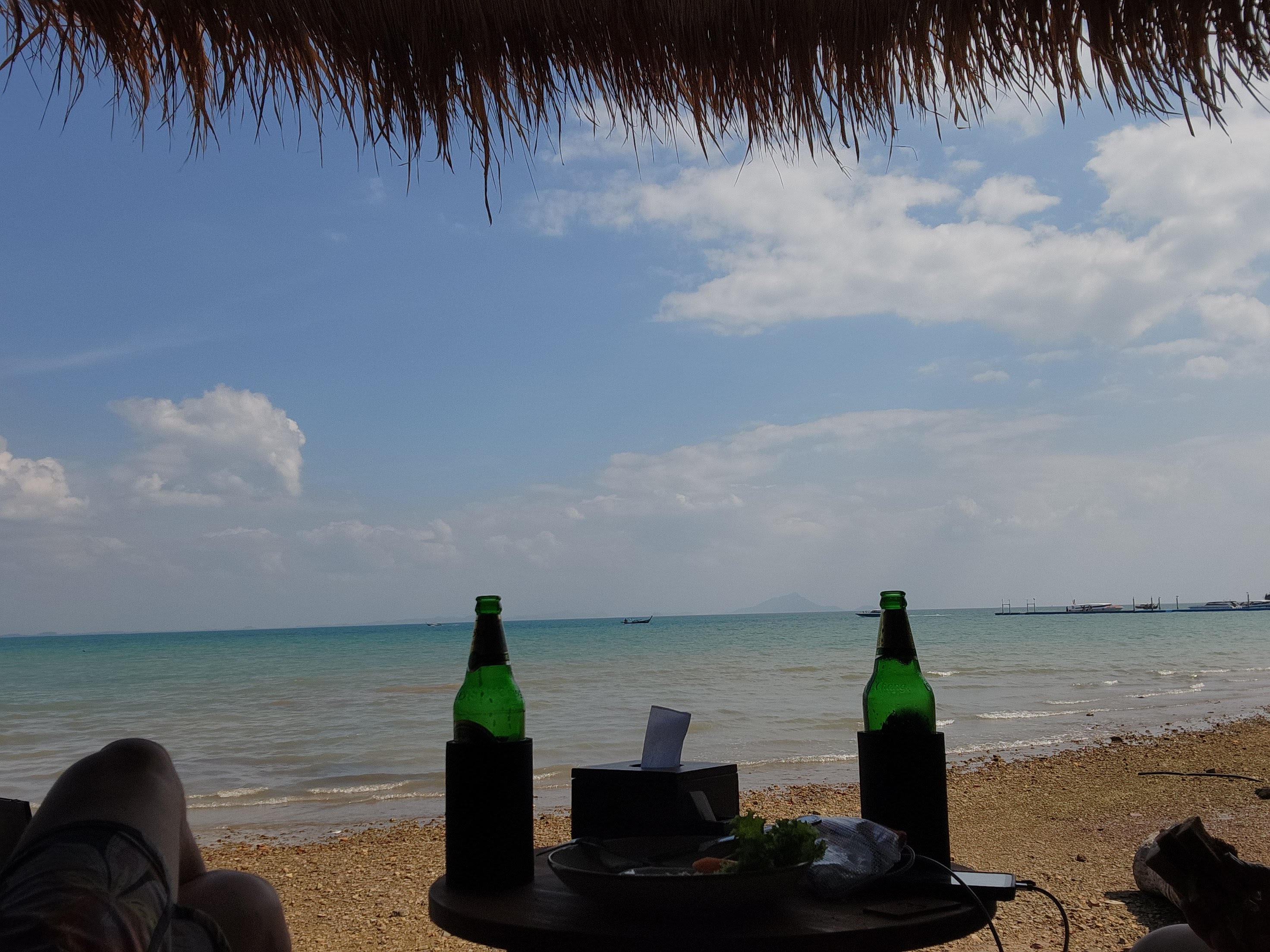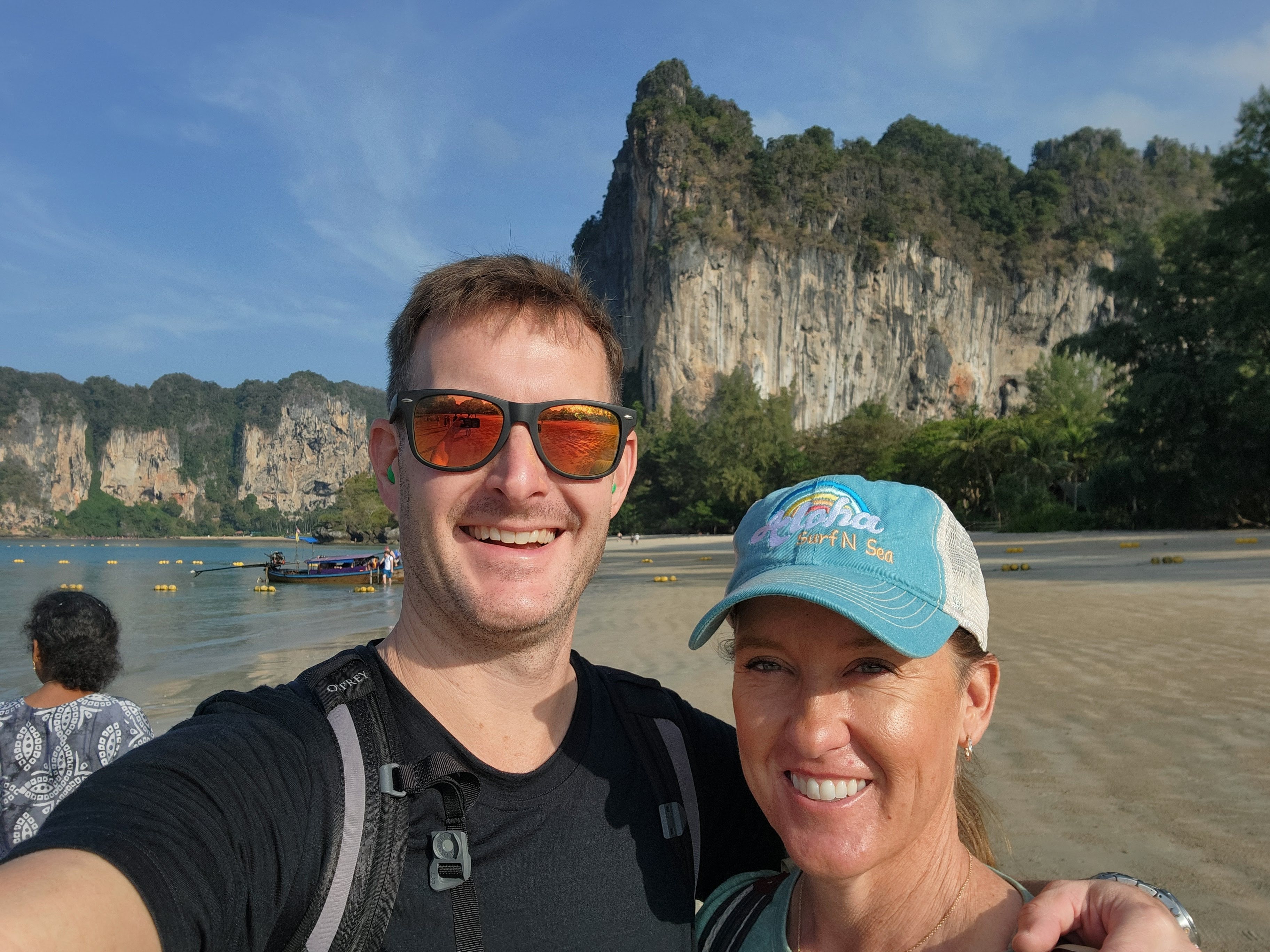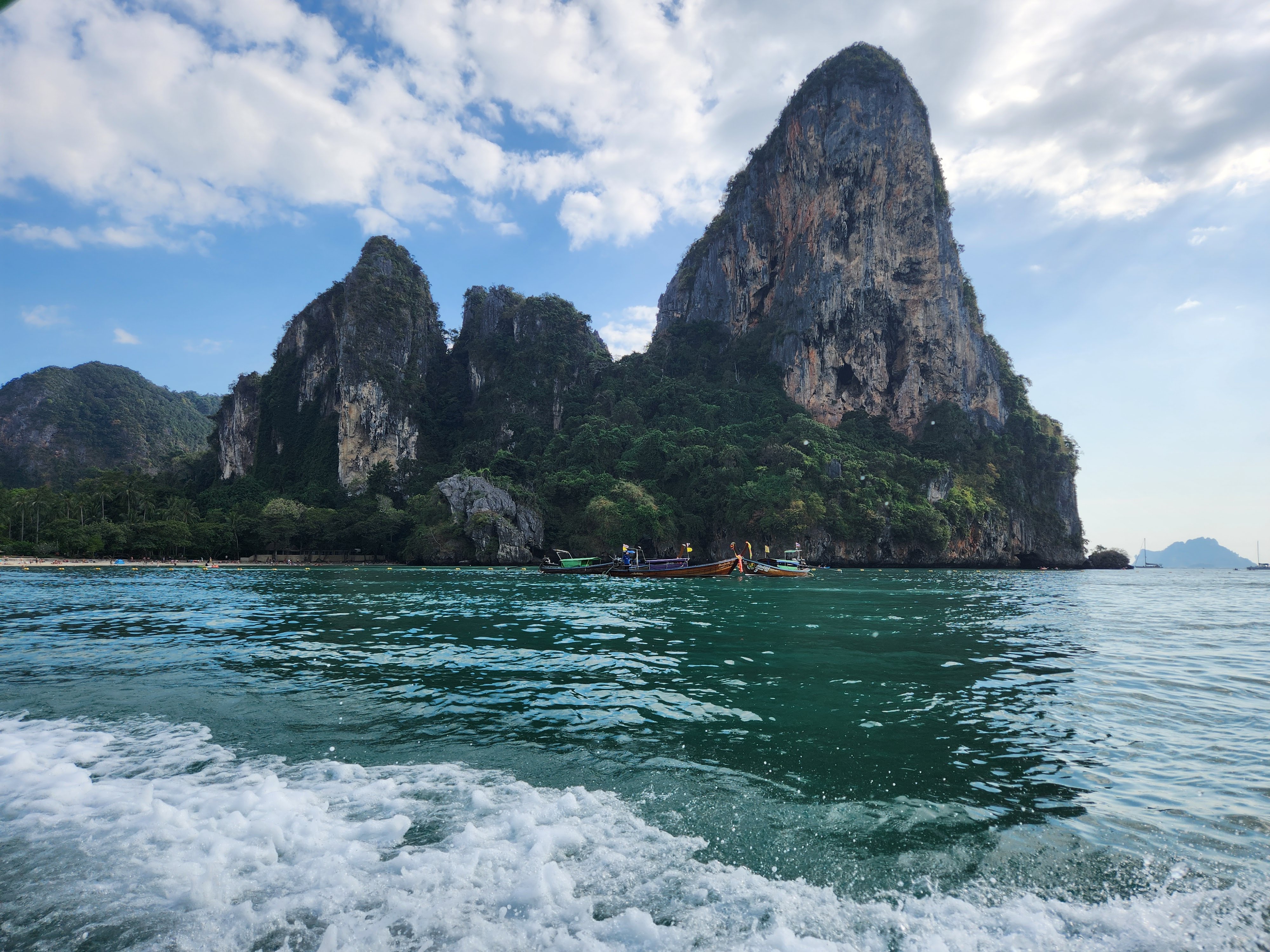 The beach was absolutely packed which made for interesting people watching and the longtail boat traffic was wild. There was a steady stream of them constantly coming and going, and while we had learned from YouTube travel videos that they were prolific in their numbers and in their racket, we didn’t get a true sense of it until we saw it in person. They would pull up onto the beach and throw their anchors at the water’s edge, deposit some passengers who then waded to shore, wait a few minutes, then load their next haul of passengers and take off across the horizon to some other place- most likely Railay Beach which was close by.