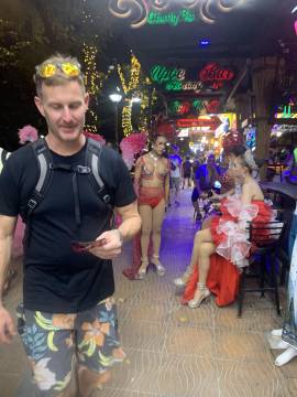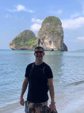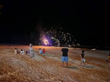 We headed back to our hotel for a shower before venturing back into town for dinner at a spot near the beach. (We walked so much this day- it was our record for most steps taken during the whole trip at almost 25,000!) On our way to the restaurant we booked a catamaran trip for the next day at a kiosk in town. We then enjoyed a sit-down dinner and after, picked up some cold Chang beers3 to sip while sitting on the beach while we were waiting for the fire show that was hosted by a local beach club to start. While waiting we actually saw that another fire show was happening further down the beach so we strolled down to watch and were suitably impressed. When that one finished we headed back up the beach and we got front row seats on the lawn and were thankful that we had, because what a show it was! These guys were unbelievable and took their fire show to the next level compared to the warmup act that we had watched a few minutes before. I even got to hold one of the props while one of the performers held the other end of the spinning ring of fire. When it ended we made the 1.5 km trek back uphill to our hotel, exhausted from all the walking but also from all the fun that we’d had exploring Ao Nang and Railay.