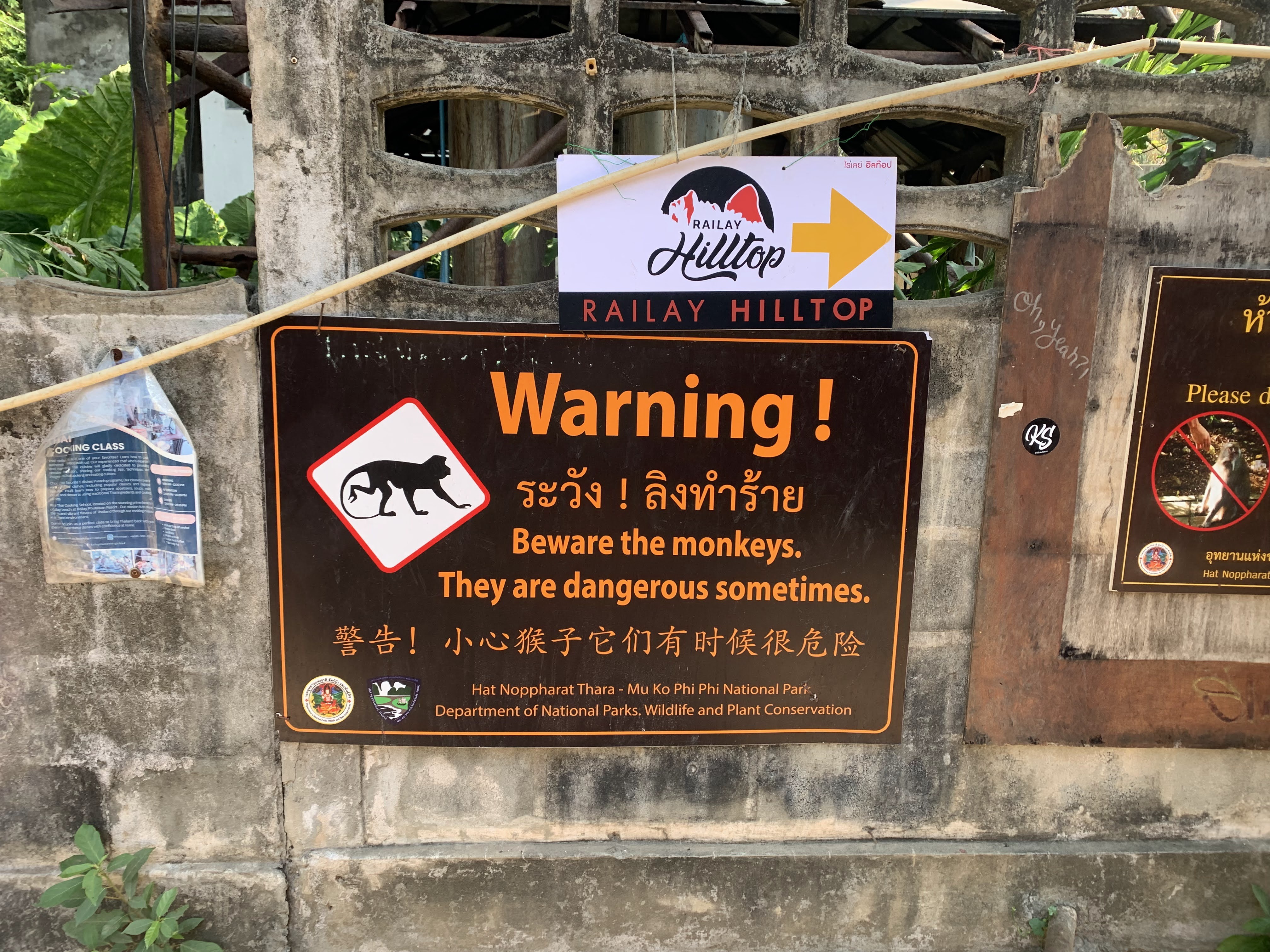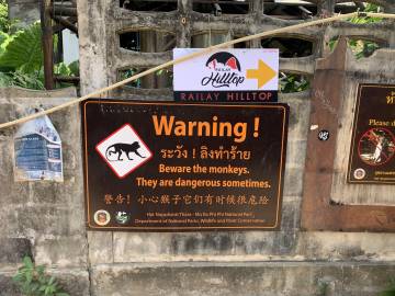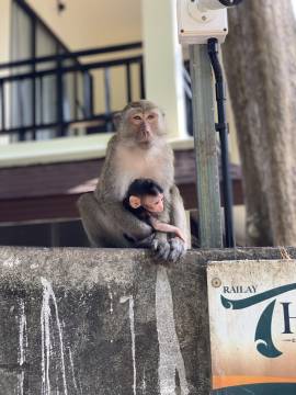 Along the pathway as we were heading back from lunch, we encountered an entire rowdy troop of macaques. I was thrilled to see them and even more thrilled to witness the moment that one of the rowdiest of the bunch plucked just-purchased food right off the plate of an unsuspecting tourist while baring his teeth at her, daring her to fight him off. The signs that were posted all over the island warning of aggressive monkeys were not put there just because. They were indeed aggressive. It was entertaining (and slightly unsettling) to watch them climb and swing on the electric utility wires above our heads. We saw one monkey that was perched atop a fence gnawing on part of a chicken carcass be chased by a mother monkey, her infant clinging tightly to her chest as the chase ensued. I could have sat there for hours and watched them but Scott summoned me and we headed through the shops of Railay (bustling and alive now that it was later in the day) and to the water’s edge for our water taxi.