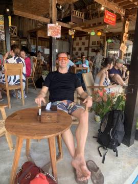 This path split and we Scott decided we should take it to the end before heading back to the beach. Along the way, we figured out that this end of the island had all the restaurants, hostels, souvenir shops, and eventually resorts. When we reached the terminus of the pathway, Scott ventured up the hill to see what lay up there (a resort), and I plopped down on a resort lounge chair for a rest. We were hot and sweaty by this point and decided to actually go find the beach now.