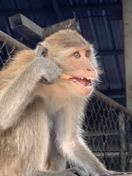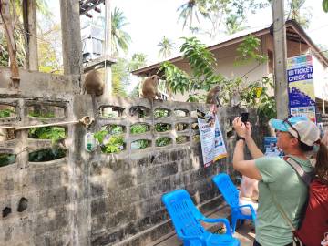 We retraced our steps and eventually reached an intersection near a floating dock and another spot where longtail boats and some other larger boats were dropping passengers off. We saw several areas where rock climbing lessons were taking place and while watching that, had our first monitor lizard and monkey spotting! The macaque monkeys would jump out of trees and land with a huge “thud” on the rooftop of the bathroom, before scrambling into the overhanging trees and climbing up the mountain. (Being inside the bathroom building while they were doing this was rather interesting and quite loud!)