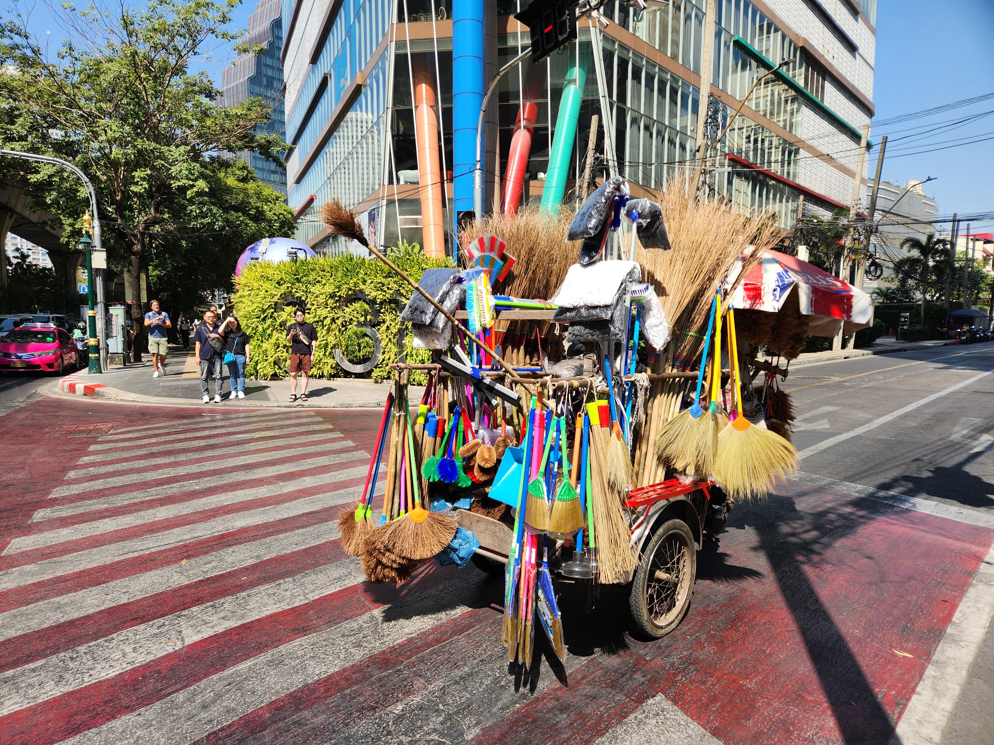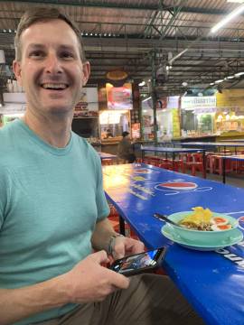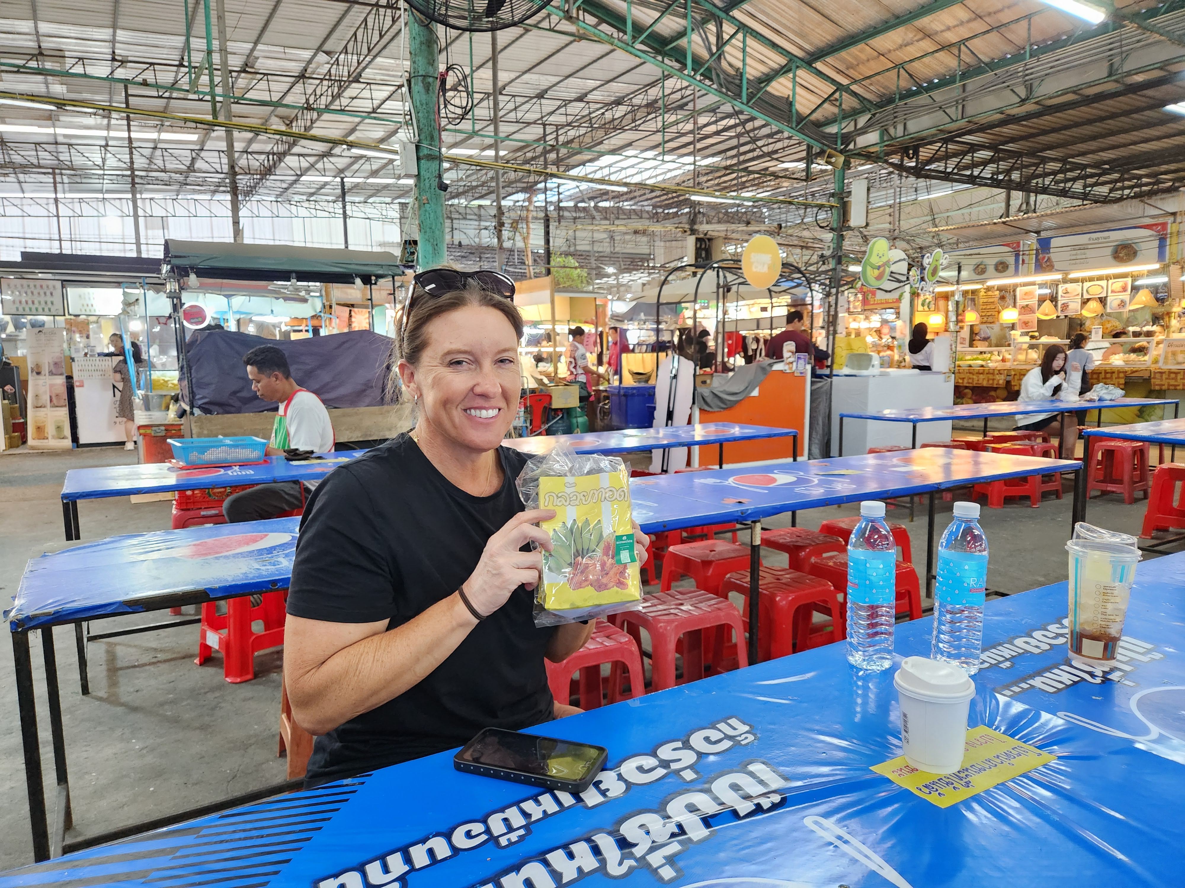 The food court was in the Ruam Sap Market and was part typical Asian market and part food stalls. Scott went first in search of food while I stayed at a table to babysit our bags and he came back with some sort of spicy egg and pork sausage noodle dish. I wasn’t feeling particularly adventuresome yet and settled on some fried bananas but did eat the leftover noodles and broth from Scott’s dish that he shared with me, carefully eating around the meat. (The walk to the market had left me feeling suspicious of meat thanks to all the street food vendors and questionable non-existent food safety practices we encountered along the way.)