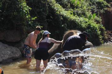 As soon as the treat balls were gone the elephants marched down to the river with the mahouts and with us trailing along. We were given bowls to splash the elephants and were told to be careful if they laid down in the river, not to get entangled with their legs, or else we would get squished when they went to stand up. Some got into the river and immediately dropped down to wet their bodies and others stayed standing. Water was flying everywhere as the group went about the business of dousing the elephants. When they were thoroughly wet, a group picture and water fight (with just humans) ensued as the mahouts guided the herd out of the river and up to the giant mud puddle for their mud bath.