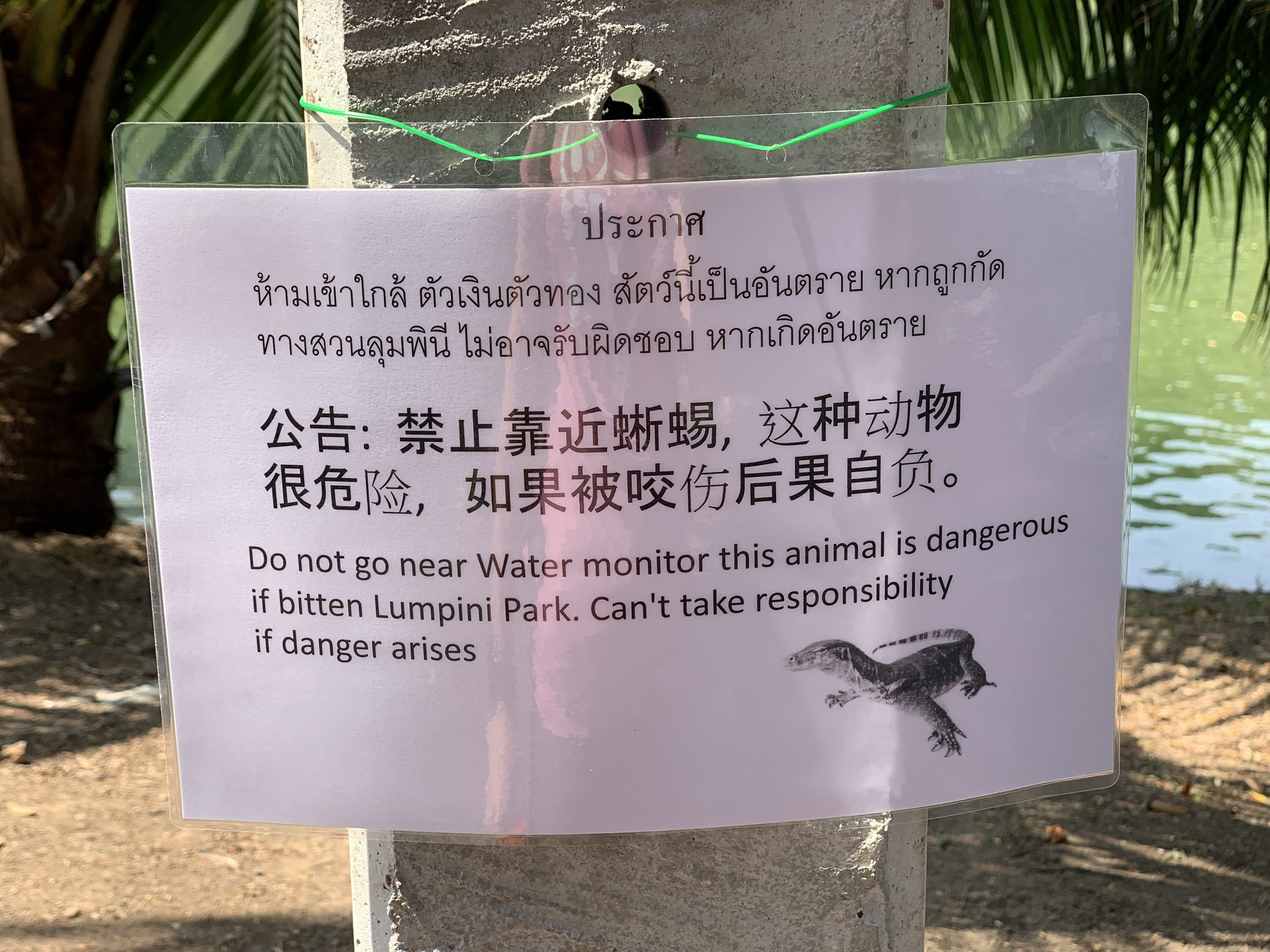 He got out of the tub rejuvenated and we decided to go to Lumphini Park for a picnic and to hopefully be able to see some of the “lumphini lizards” that it is home to. Lumphini lizards are actually Asian water monitors and are close relatives of the Komodo dragon. We had seen them referenced in a lot of the YouTube videos about Bangkok that we had watched during our trip planning and were eager to see them in person; the idea of alligator sized reptiles roaming casually around a city park piqued our interest.