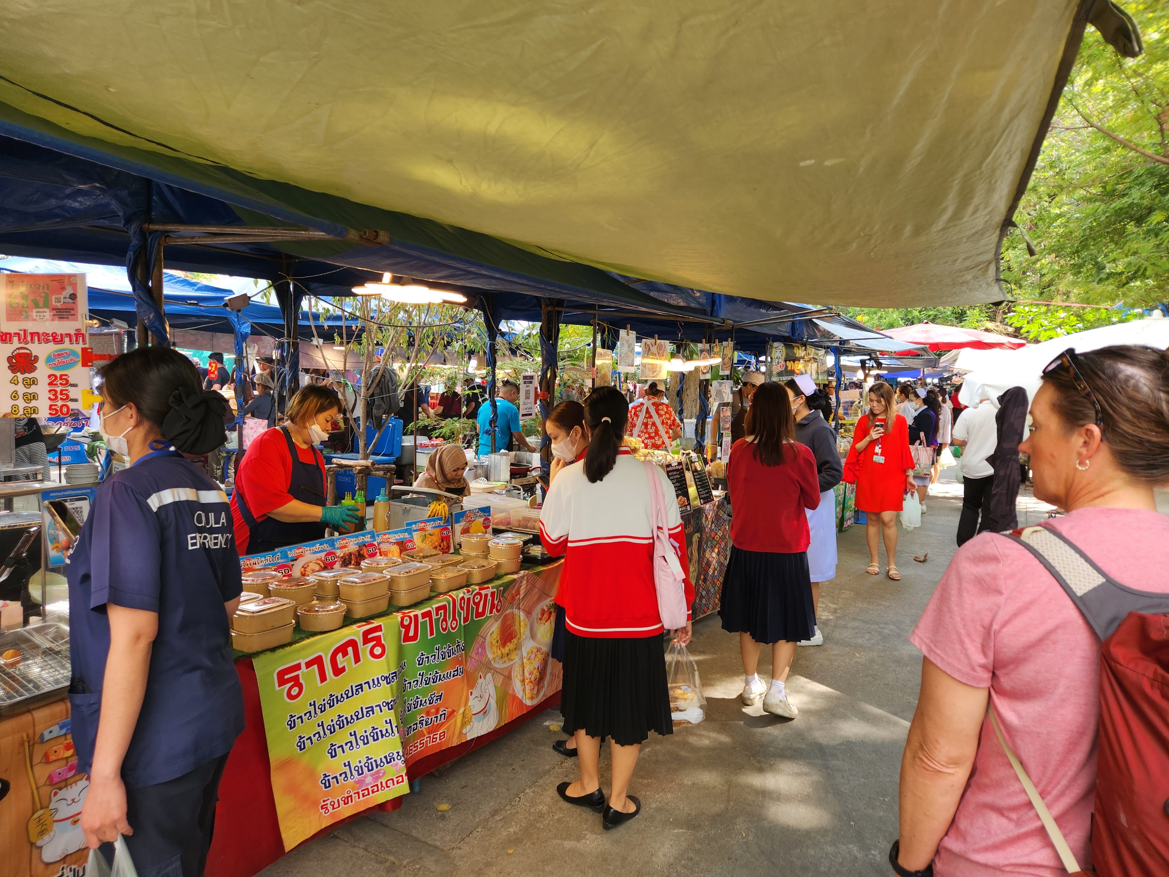 Our walk to the park took us through the beautiful Chulalongkorn University campus, or Chula University as it is more commonly known. The largest university in Thailand, its campus reminded us of a stateside school with its tree lined walkways, carefully tended gardens and lots of student activity. It hosts a medical school and we are hypothesizing that it’s because of this that the on campus outdoor food market that we visited gave the most nods to food handling safety that we had witnessed to date in Thailand. There might not have been any plastic gloves or hand washing going on but the vendors had erected a very crude sneeze-guard with saran wrap so there is that. Since this was our last day in Thailand we went a little crazy on buying Thai foods to try and got a little bit of this and a little bit of that from several stalls (all for just a few US dollars) to supply our picnic. I was hoping for some roti but unfortunately didn’t find any.