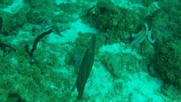 While I was teaching the morning sessions he went on his last dive at the Fredriksted cruise pier and it turned out to be his best and favorite one of the week. He was out for a little over an hour and came across a puffer fish and a little sea turtle that was perched atop some coral on one of the pier piles sleeping. His most exciting discovery of the dive was a trio of octopuses and he was able to watch them for a few moments, fascinated by their ability to change their color on demand to correspond with their surroundings as they glided around the seafloor.
