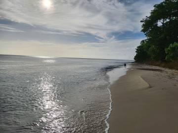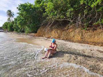 So after enjoying one last coffee time on the hill overlooking the Caribbean, Scott dropped me off at Rainbow Beach with my beach bag, colander, and the hammock, and headed to William’s field to shoot. I spent the morning floating and glass hunting, savoring the last few moments of island beachtime before we would head back to SC.