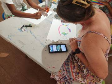 We went into the Caribbean Museum Center for the Arts, a gift shop/art gallery featuring works and pieces from local artists that I’d spied earlier in the week but never got a chance to visit since it had always been closed until this evening. Scott asked the clerk about the festival and she also told him about the “Free Flow” session they were hosting upstairs. Participants were invited to “unleash your inner CREATOR” and try their hand at art. She hadn’t even gotten the words out of her mouth before Scott was bolting up the stairs, leaving me in a cloud of dust. I trailed after him trying to see where he had gone and found him upstairs talking with the volunteer docent.