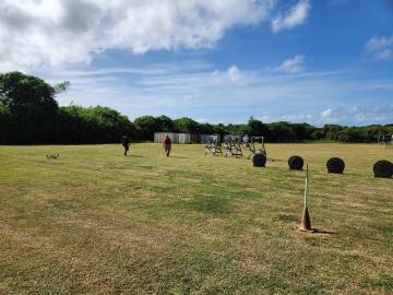 It had been probably ten years since he had last shot and he had never received any formal instruction, so today was enlightening to have the rigor that William’s instruction brought. They worked on posture and the shot sequence and refined those details. While William was working with Scott, eventually another couple showed up so he went over to work with them. The program is free and serves to get island residents interested in the sport of archery. It seemed fitting that Scott end his “summer camp” experience with such a quintessential summer camp activity.
