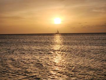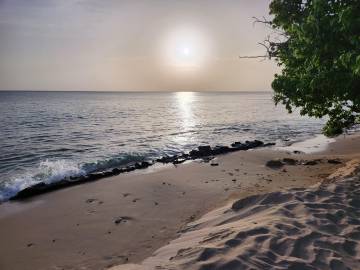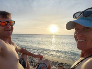 When I was somewhat cross-eyed from my glass search and my back was starting to complain from being crouched over, I headed back to the hammock where Scott had positioned himself. He poured me some of our Cruzan pina colada mix and we enjoyed watching families celebrating their holiday at the beach, swimming and picnicking. From our hammock we bore witness to the sunset over the Caribbean, the day made special by having said both “hello” and “goodbye” to the celestial body around which our planet revolves before we called it a day and headed back to Hilltop House.