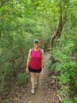 A guard at the gated entrance of the Carambola Beach Resort laid out our parking options when we arrived at the trailhead to the tidal pool hike. None of them were ideal but Scott did a good job nimbly and carefully navigating Miss Bettye’s Escape into the best of the bad options as we drove up a road better suited to a rugged 4x4, following the guard’s instructions to park in the field that “doesn’t look like it is a parking lot but it is.” We got out and began the two mile hike through the rainforest to the pools.