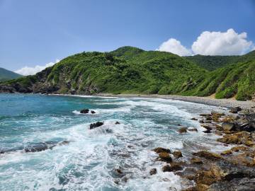 The hike was hot and steep but the views of the Caribbean that we were teased with along the way when the trees would thin enough for us to catch sight of it made us push on. When we finally arrived at the rocky shoreline we were rewarded with stunning views; the mountains rose up around us, the turquoise water before us, and the sound of the surf moving the rocks around as the waves crashed against the shore all around us. We saw some people crawling over rocks a few hundred meters away and figured that was the way to the pools. When we got to the group, they indicated that we were on the right track and we climbed up the rock face and over the giant boulders to reach the first pool.