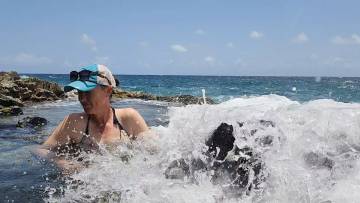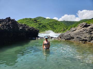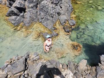 We put our stuff down and stripped to our bathing suits and waded in. We were glad we had kept our shoes on because it was rocky and there were sea urchins perched between rocks that would not feel good to step on. I did end up tangling with one when I put my hand down on an underwater rock to navigate my way through the pool and got pricked, and a few minutes later noticed that the heel of my hand didn’t have any feeling, the sea urchin’s venomous spine had numbed it. After that I was much more careful at scouting for them.