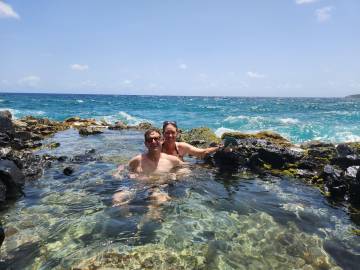 The pools were teeming with aquatic life, a micro-ecosystem at play, and we saw several species of fish and sealife, but luckily didn’t see the venomous sea snakes that some people have reported spotting in the pools. We enjoyed swimming and exploring and made our way to each of the pools in the series. We stopped at one that had the most clear opening to the sea and sat on the boulders and periodically got soaked by waves as they crashed against the rocks spraying surf that rose up several meters into the air and deposited more water into the pools. It was reminiscent of our trip to the Queen’s Bath in the Mokes in Oahu.