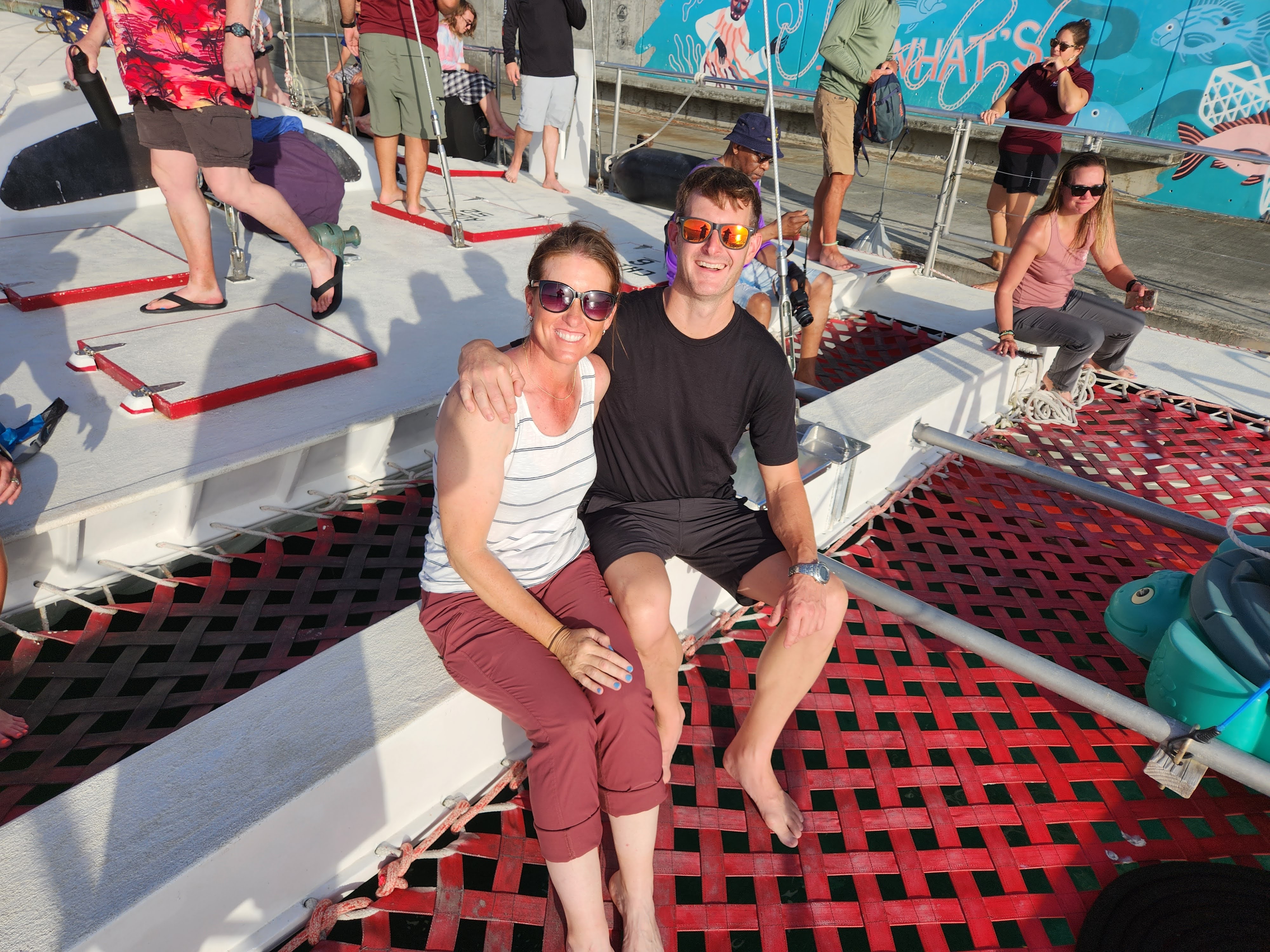 We boarded and grabbed seats at the front near the catamaran’s trampolines (the nets at the front). While waiting to board, we had noticed a woman furiously hacking away at the biggest rat’s nest of a tangle on her head with a hairbush, and now she sat a few feet away from us, still hacking away, making seemingly zero progress. We found this a little odd and guessed that eventually she would stop once we set sail. Nope. She continued to attack the snarl throughout the entire cruise. We finally pieced together that she had been snorkeling with her hair loose and this is how she got the impossible tangle. She battled it so ferociously that eventually the captain of the boat came to offer her some sort of detangler or hair oil, which although she accepted, seemed to do little to convince it to let go. I imagine her back home almost a month later still working on this thing.