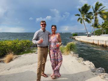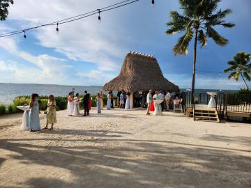We arrived fairly early to the wedding venue, The Key Largo Lighthouse Beach, so we had some time to walk around and admire the property and its waterfront views. They had picked the most idyllic spot to get married. Holly was a beautiful bride and her brother Gus served as the officiant and was his typical goofy self which was perfect. I cried happy tears as she and Bradley said their vows. Holly’s brother-in-law was in charge of FaceTiming Holly’s father who unfortunately was not able to travel to the wedding due to an emergency abdominal surgery a few days prior. They kept the ceremony short and sweet and then we were sent to the pre-reception cocktail hour that featured a tiki-hut bar right on the water.